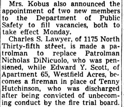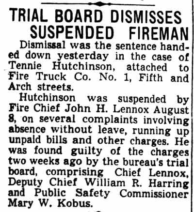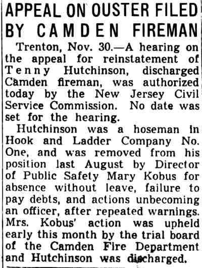 TENNIE GAGE HUTCHISON was born in Camden, New Jersey in May of 1898 to Tennie and Lillie Hutchison. Tennie G. Hutchison was the grandson of Captain John G. Hutchison, who had "sailed the seven seas" before marrying a girl from Camden and settling in the city. For over 30 years Captain Hutchison served as Superintendent of the West Jersey Ferry, a post he held with distinction prior to his passing at the age of 68 on June 29, 1896. Captain Hutchison survived by four sons and four daughters. One son was Tennie Hutchison, who had a plumbing business in Camden for many years. The 1900 Census shows Tennie Hutchison, his wife Lillie and sons George, Harold, and young Tennie G. living at 324 Berkley Street in South Camden. By 1906 the family had moved to 414 Stevens Street where they remained through at least 1914. The 1918 City Directory reveals that Tennie G. Hutchison had married. He was working as a plumber and living with his wife Veronica at 623 Line Street. A son, Tennie G. Hutchison Jr., was born in July of 1918. The Hutchisons were still at 623 Line Street when the 1920 Census was enumerated. Tennie G. Hutchison was then working as a repairman at a garage. On December 30, 1920 Tennie G. Hutchison had been appointed to the Camden Fire Department. He and his family were then living at 648 Clinton Street. His parents and brother Harold then lived at 617 Clinton Street, while brother George lived at 619 Clinton Street. The 1927 City Directory states that Tennie G, Hutchison was working as an auto mechanic and living at 925 South 9th Street. However, the 1929 City Directory shows Tennie G. Hutchison was again working as a Camden fire fighter. He was then living at 708 Spruce Street. Fire Department records from 1931 show that Tennie G. Hutchison Jr. was an active member of the department and was then living at 530 Trenton Avenue. There were a number of disciplinary infractions during the 1930s. For going absent without leave in September of 1937 he was given a month-long suspension on October 1, 1937. He was suspended again on August 18, 1938 with intention to dismiss on August 8. He was tried and found guilty during a departmental trial on November 4, and dismissed on November 18, 1938. By 1940 Tennie G. Hutchison he had gone to work as a machinist at the New York Shipbuilding Corporation shipyards in South Camden. Tennie G. Hutchison was then living with his wife Veronica and sons Tennie Jr. and Kenneth at 935 Pearl Street. By the time the 1943 City Directory was compiled the Hutchisons had separated. Mrs. Hutchson and the children had settled at 49 North 22nd Street in East Camden. By 1944 Tennie Hutchison had gone down to Salem County and had found emplyment at the du Pont plant in Gibbstown. In