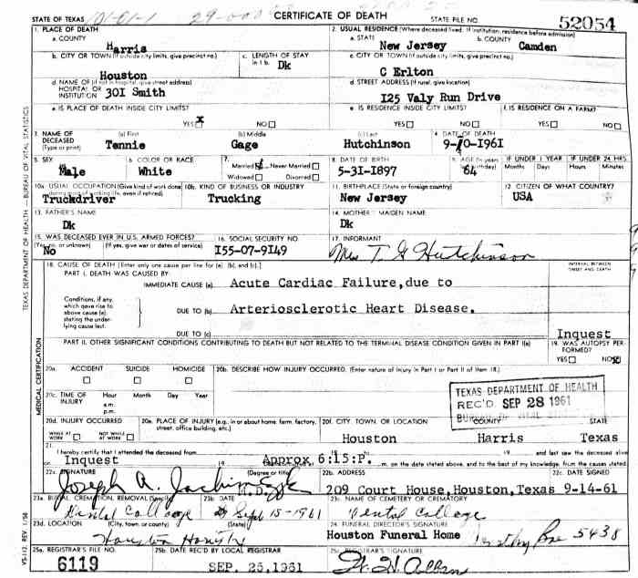 on by arteriosclerotic heart disease on September 11, 1961 in Houston, Texas. |