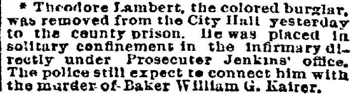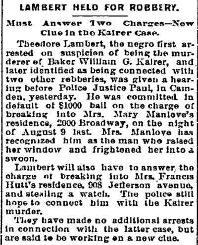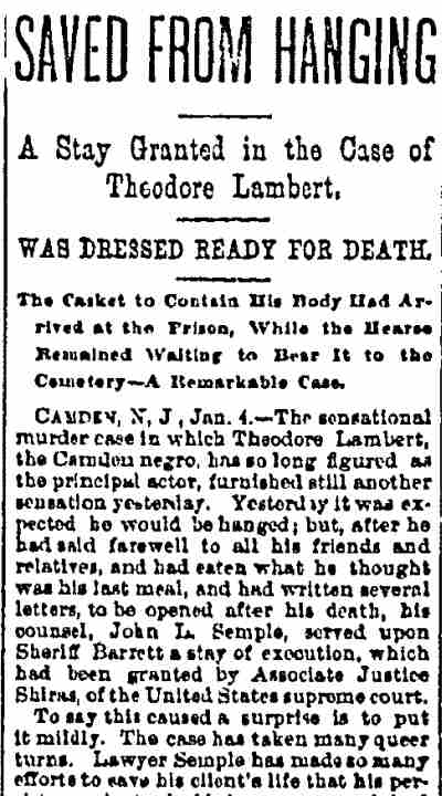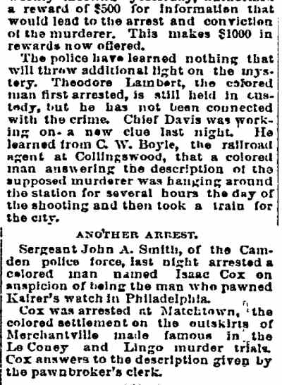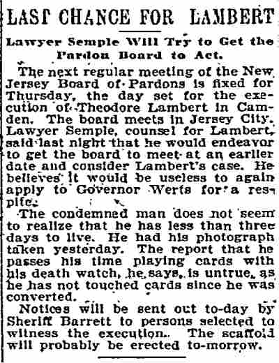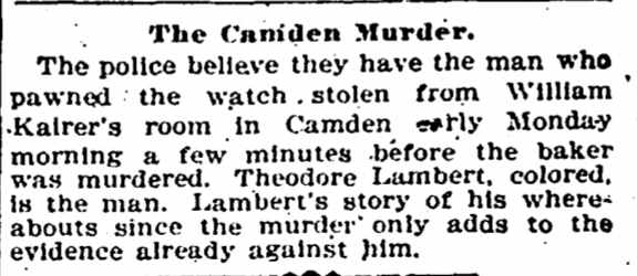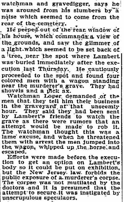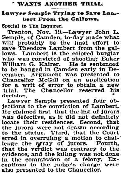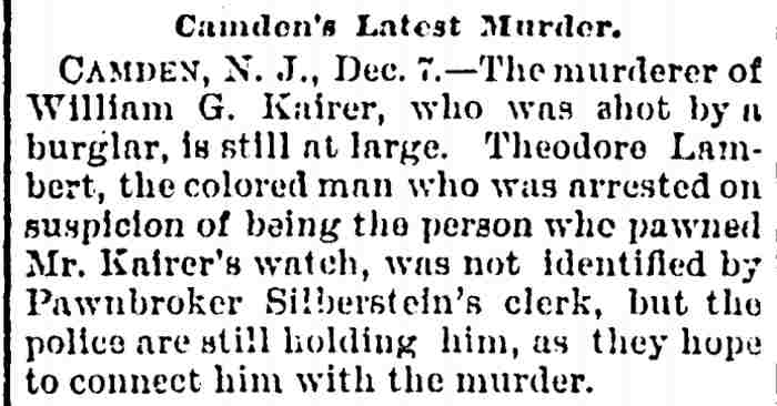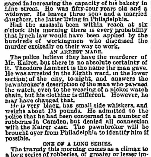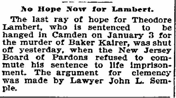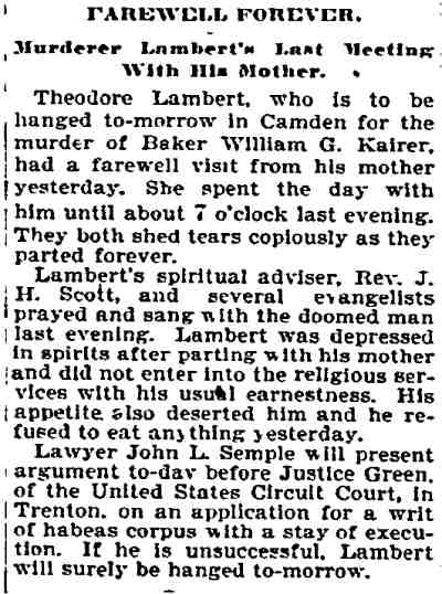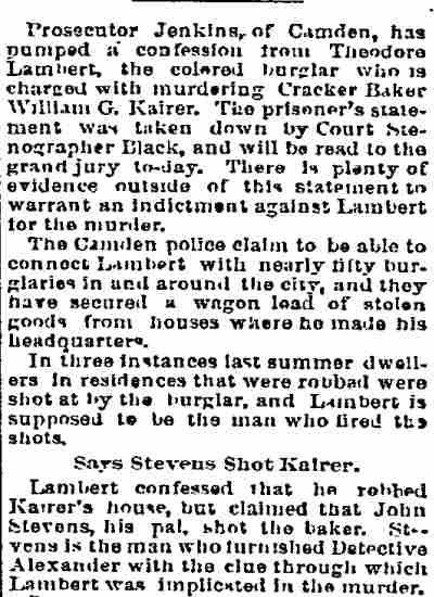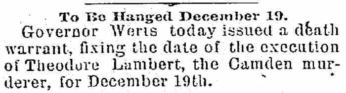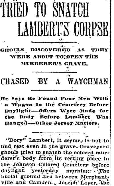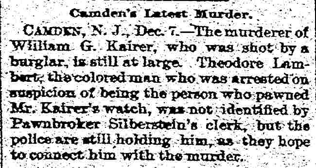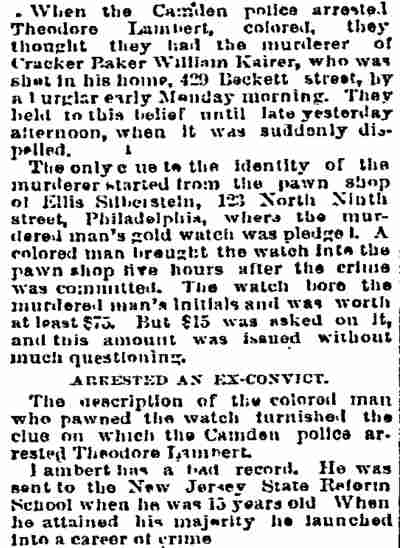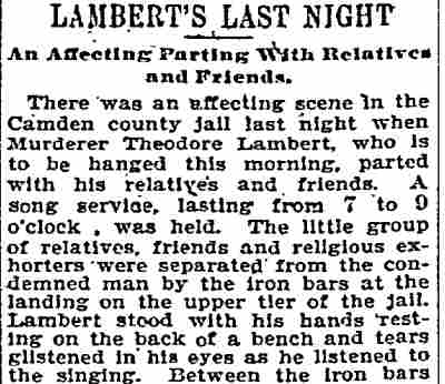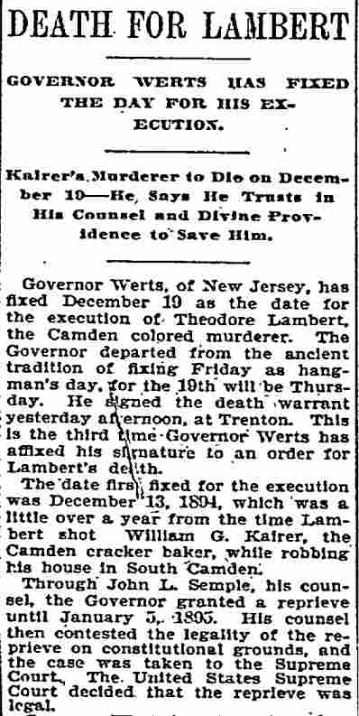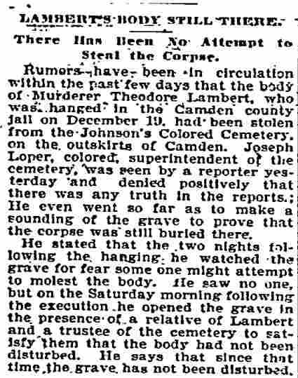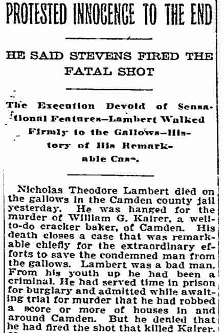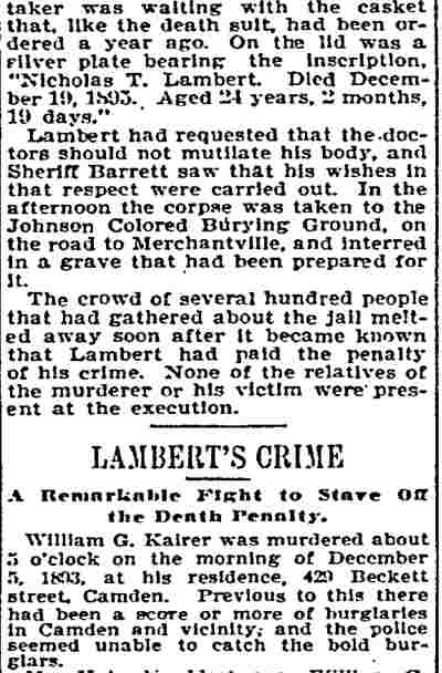 THEODORE LAMBERT was born Nicholas Theodore Lambert on September 20, 1871 in Camden's old Eighth Ward, to Annie and Theodore Lambert. His father was a veteran of the Civil War, serving with Company G of the 25th Regiment, U.S. Colored Infantry from February 1, 1864 through December 6, 1865. The 1870 Census shows Theodore and Annie Lambert living in Newton Township, which was dissolved and incorporated into Camden the following year. The Lambert family resided in and around South 9th Street and Ferry Avenue in Camden's Centerville neighborhood. While the elder Lambert appears to have been a respectable fellow, a war veteran who lived to a ripe old age, his son, also known as "Dory" Lambert was not. Theodore Lambert was thoroughly evil, a violent career criminal who was in and out of prison. Young Lambert was in the midst a spree of burglaries that had numbered at least twenty when, on December 4, 1893 he broke into the home of William G. Kairer Sr., well-known and respected baker, who lived at 429 Beckett Street, the corner of Beckett and Avon Streets, in South Camden. There Theodore Lambert shot and killed Mr. Kairer, who had been woken to the nose of the burglary.. Theodore Lambert was arrested, tried, and after numerous appeals, on December 19, 1895 executed at the Camden County Jail for murdering Mr. Kairer. He was buried at the Johnson cemetery on Federal Street in what is now East Camden. |