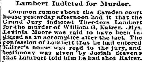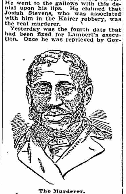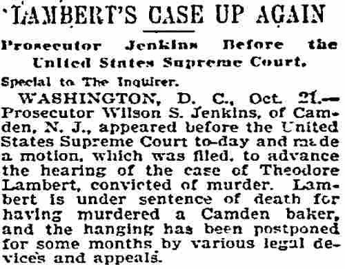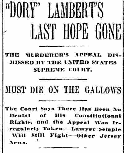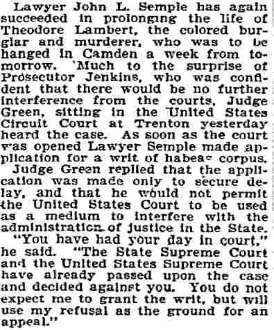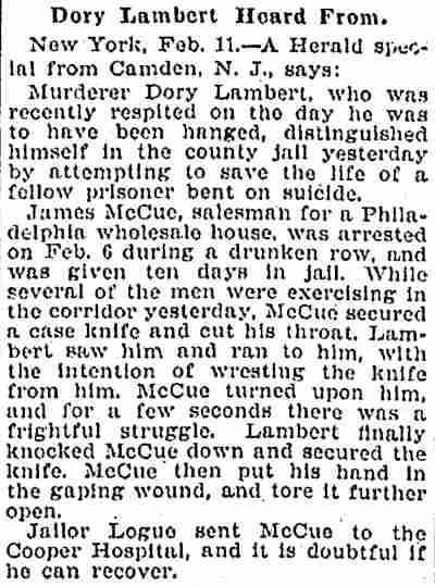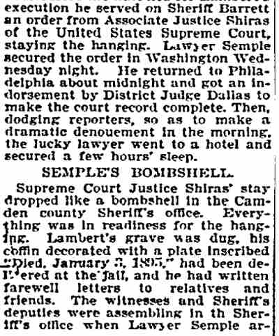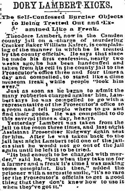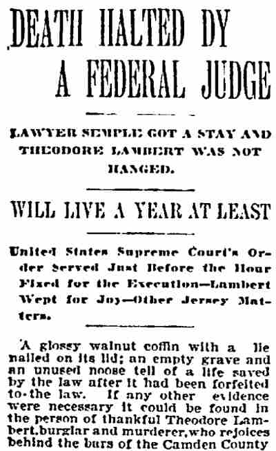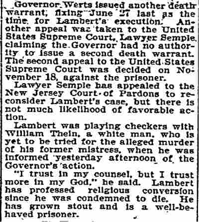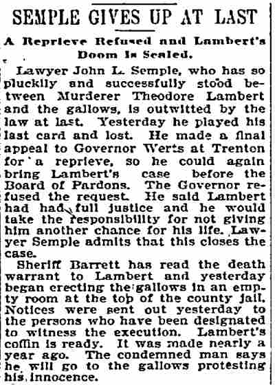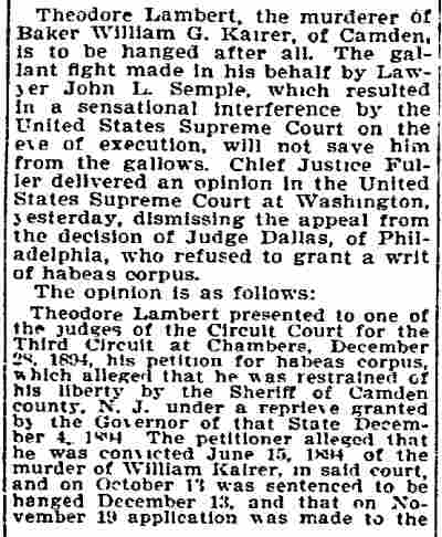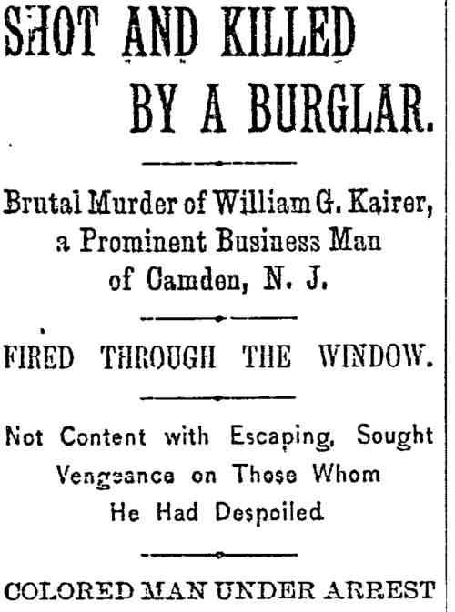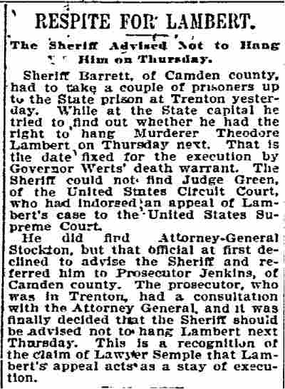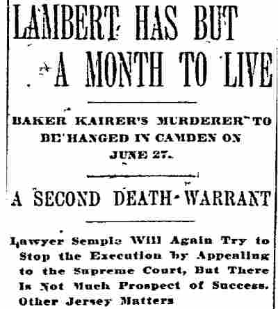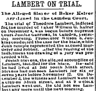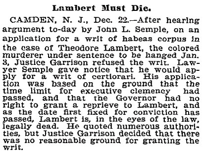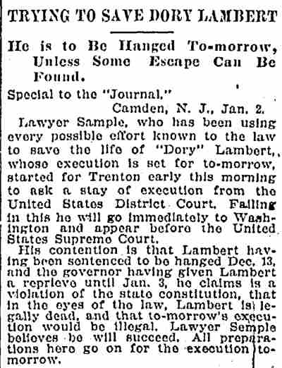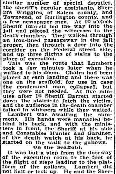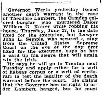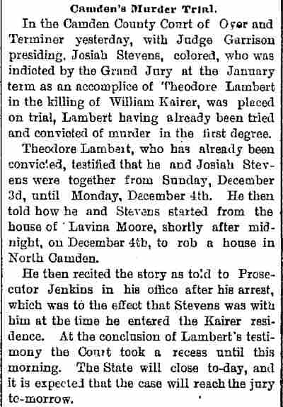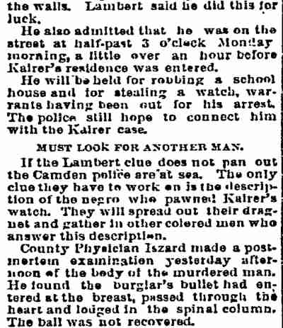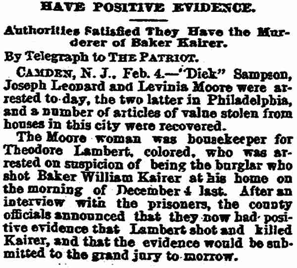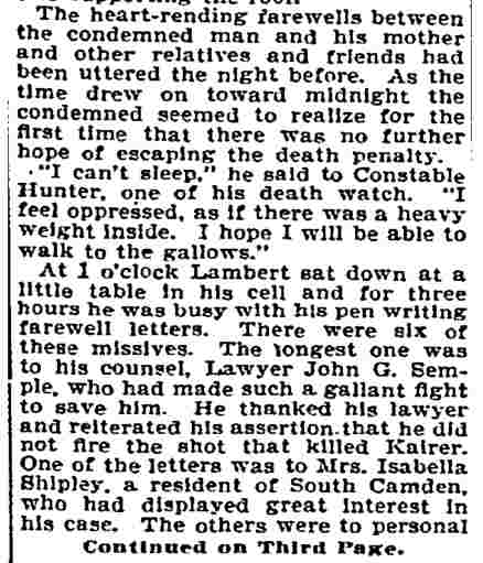 THEODORE LAMBERT was born Nicholas Theodore Lambert on September 20, 1871 in Camden's old Eighth Ward, to Annie and Theodore Lambert. His father was a veteran of the Civil War, serving with Company G of the 25th Regiment, U.S. Colored Infantry from February 1, 1864 through December 6, 1865. The 1870 Census shows Theodore and Annie Lambert living in Newton Township, which was dissolved and incorporated into Camden the following year. The Lambert family resided in and around South 9th Street and Ferry Avenue in Camden's Centerville neighborhood. While the elder Lambert appears to have been a respectable fellow, a war veteran who lived to a ripe old age, his son, also known as "Dory" Lambert was not. Theodore Lambert was thoroughly evil, a violent career criminal who was in and out of prison. Young Lambert was in the midst a spree of burglaries that had numbered at least twenty when, on December 4, 1893 he broke into the home of William G. Kairer Sr., well-known and respected baker, who lived at 429 Beckett Street, the corner of Beckett and Avon Streets, in South Camden. There Theodore Lambert shot and killed Mr. Kairer, who had been woken to the nose of the burglary.. Theodore Lambert was arrested, tried, and after numerous appeals, on December 19, 1895 executed at the Camden County Jail for murdering Mr. Kairer. He was buried at the Johnson cemetery on Federal Street in what is now East Camden. |