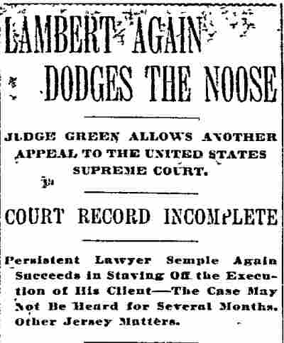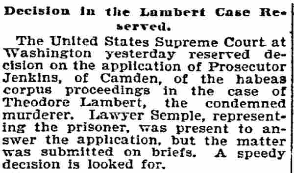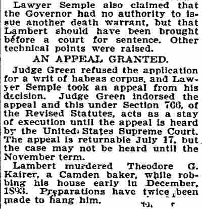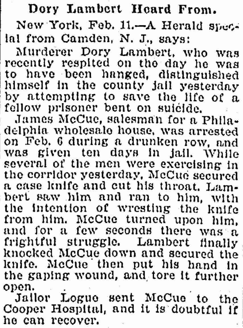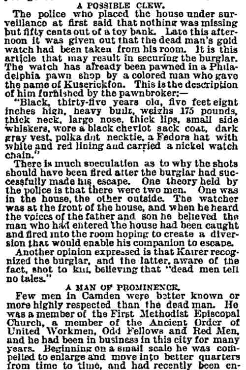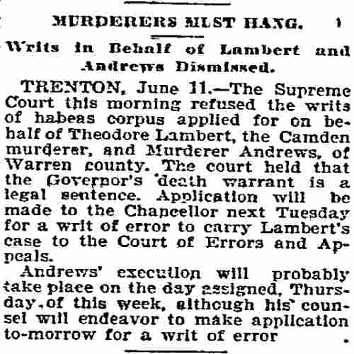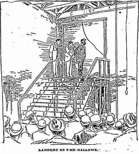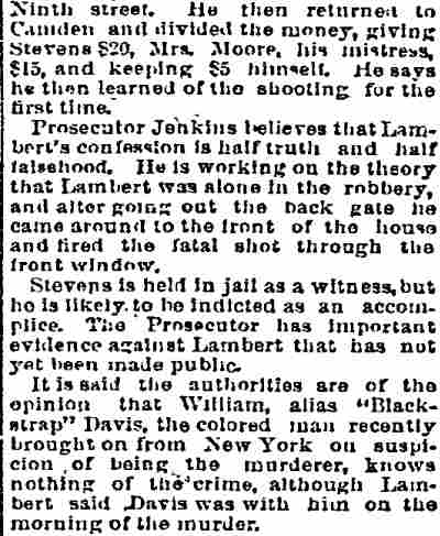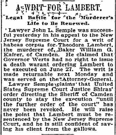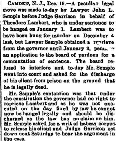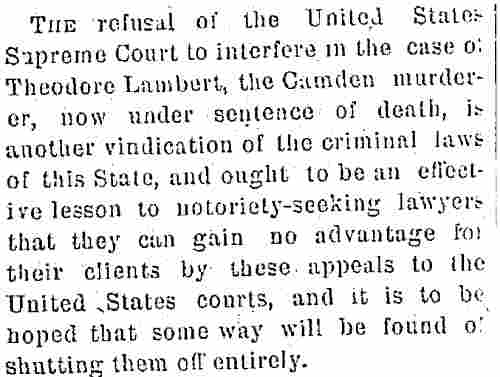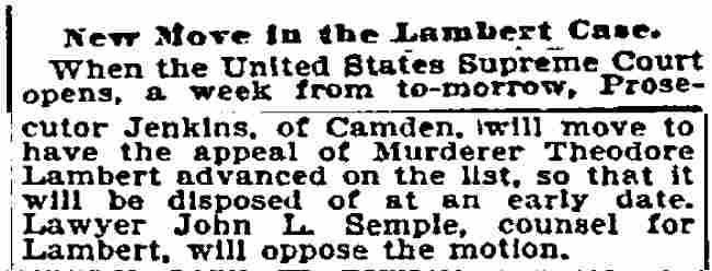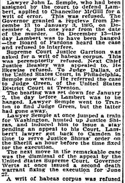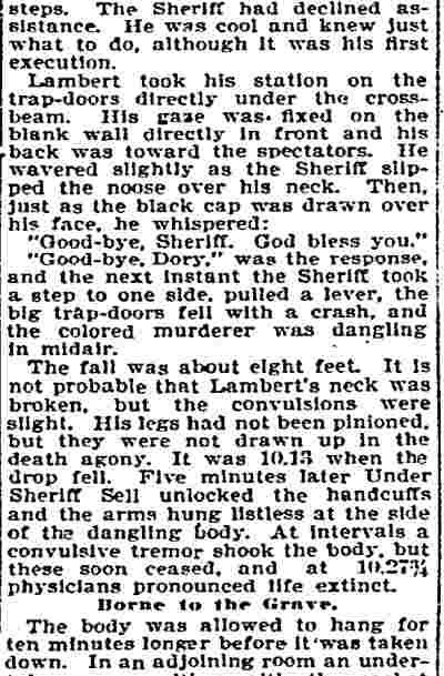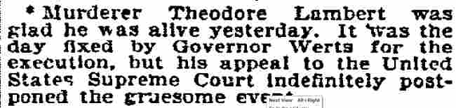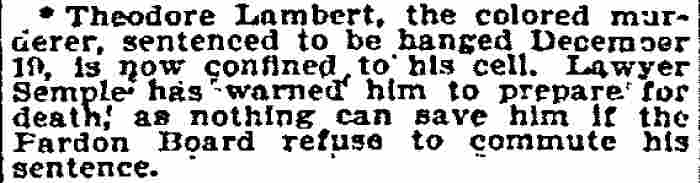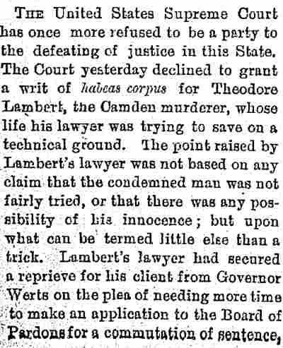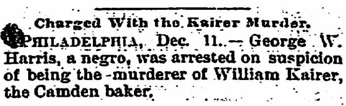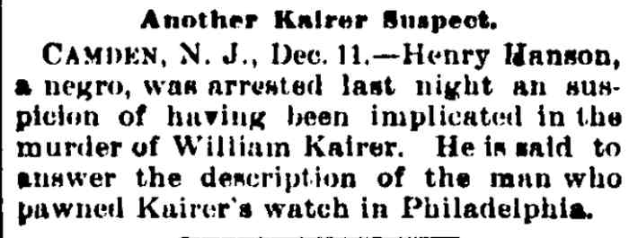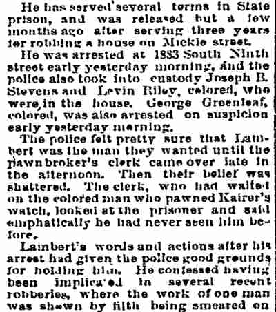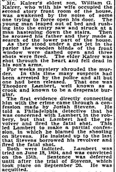 THEODORE LAMBERT was born Nicholas Theodore Lambert on September 20, 1871 in Camden's old Eighth Ward, to Annie and Theodore Lambert. His father was a veteran of the Civil War, serving with Company G of the 25th Regiment, U.S. Colored Infantry from February 1, 1864 through December 6, 1865. The 1870 Census shows Theodore and Annie Lambert living in Newton Township, which was dissolved and incorporated into Camden the following year. The Lambert family resided in and around South 9th Street and Ferry Avenue in Camden's Centerville neighborhood. While the elder Lambert appears to have been a respectable fellow, a war veteran who lived to a ripe old age, his son, also known as "Dory" Lambert was not. Theodore Lambert was thoroughly evil, a violent career criminal who was in and out of prison. Young Lambert was in the midst a spree of burglaries that had numbered at least twenty when, on December 4, 1893 he broke into the home of William G. Kairer Sr., well-known and respected baker, who lived at 429 Beckett Street, the corner of Beckett and Avon Streets, in South Camden. There Theodore Lambert shot and killed Mr. Kairer, who had been woken to the nose of the burglary.. Theodore Lambert was arrested, tried, and after numerous appeals, on December 19, 1895 executed at the Camden County Jail for murdering Mr. Kairer. He was buried at the Johnson cemetery on Federal Street in what is now East Camden. |