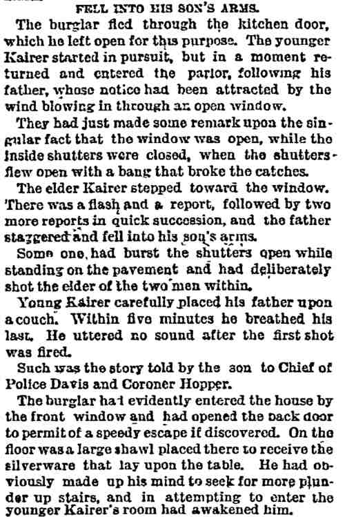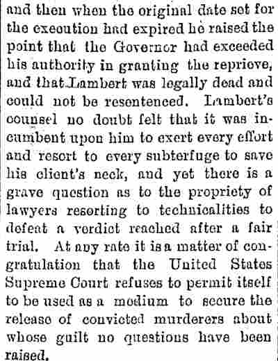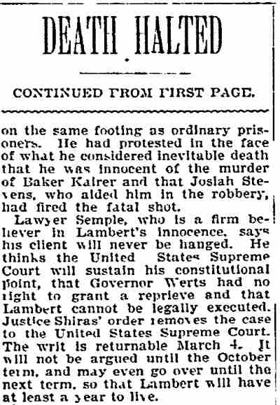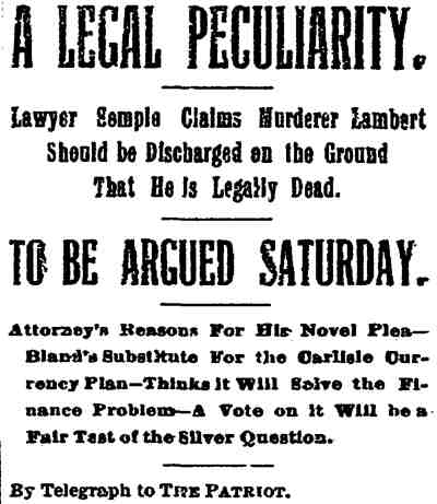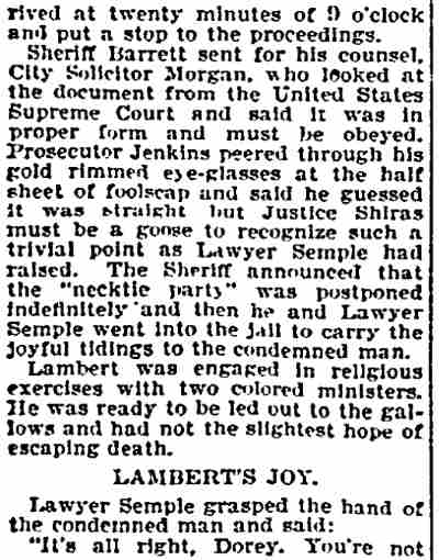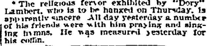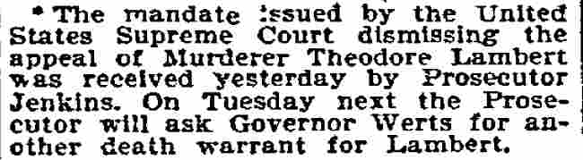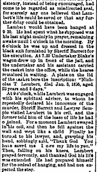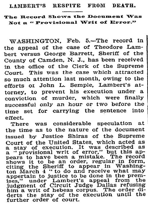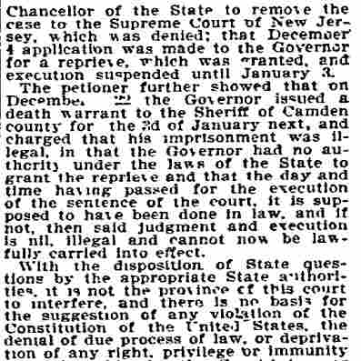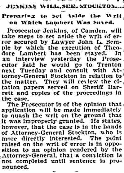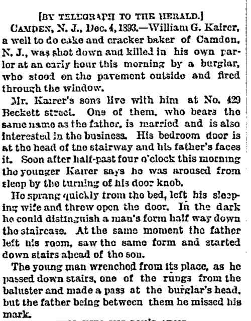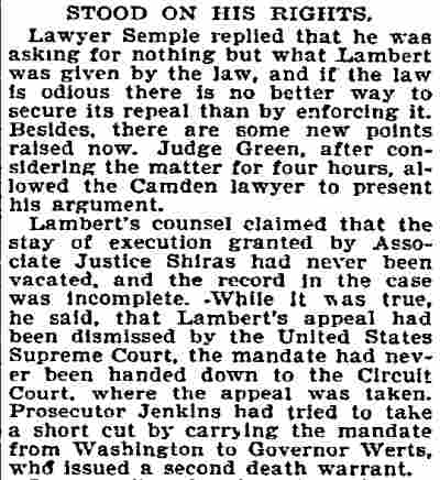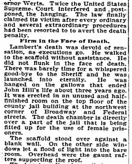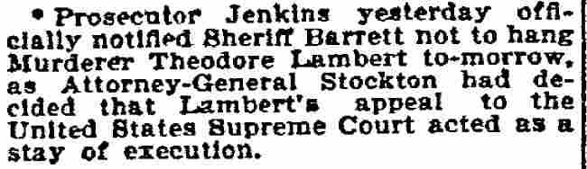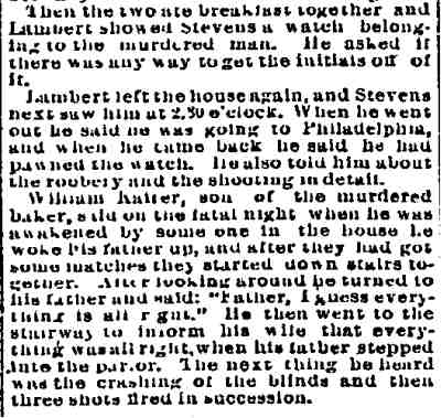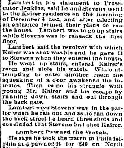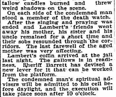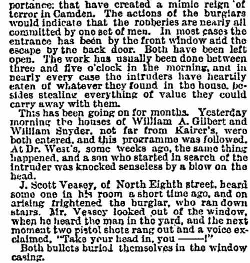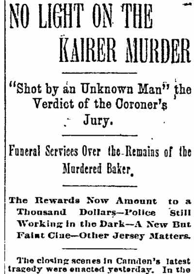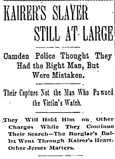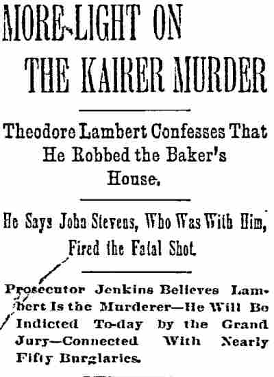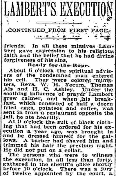 THEODORE LAMBERT was born Nicholas Theodore Lambert on September 20, 1871 in Camden's old Eighth Ward, to Annie and Theodore Lambert. His father was a veteran of the Civil War, serving with Company G of the 25th Regiment, U.S. Colored Infantry from February 1, 1864 through December 6, 1865. The 1870 Census shows Theodore and Annie Lambert living in Newton Township, which was dissolved and incorporated into Camden the following year. The Lambert family resided in and around South 9th Street and Ferry Avenue in Camden's Centerville neighborhood. While the elder Lambert appears to have been a respectable fellow, a war veteran who lived to a ripe old age, his son, also known as "Dory" Lambert was not. Theodore Lambert was thoroughly evil, a violent career criminal who was in and out of prison. Young Lambert was in the midst a spree of burglaries that had numbered at least twenty when, on December 4, 1893 he broke into the home of William G. Kairer Sr., well-known and respected baker, who lived at 429 Beckett Street, the corner of Beckett and Avon Streets, in South Camden. There Theodore Lambert shot and killed Mr. Kairer, who had been woken to the nose of the burglary.. Theodore Lambert was arrested, tried, and after numerous appeals, on December 19, 1895 executed at the Camden County Jail for murdering Mr. Kairer. He was buried at the Johnson cemetery on Federal Street in what is now East Camden. |