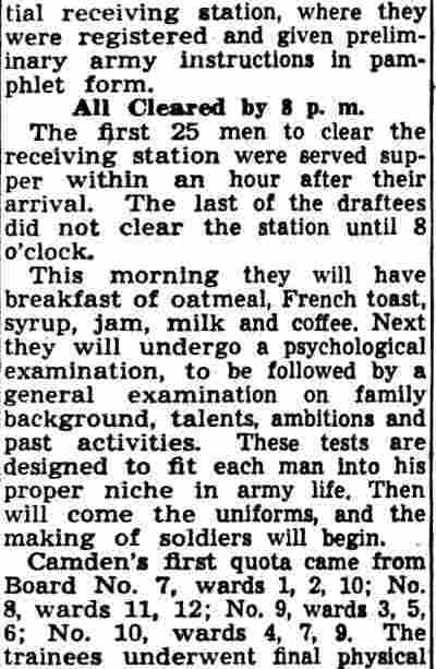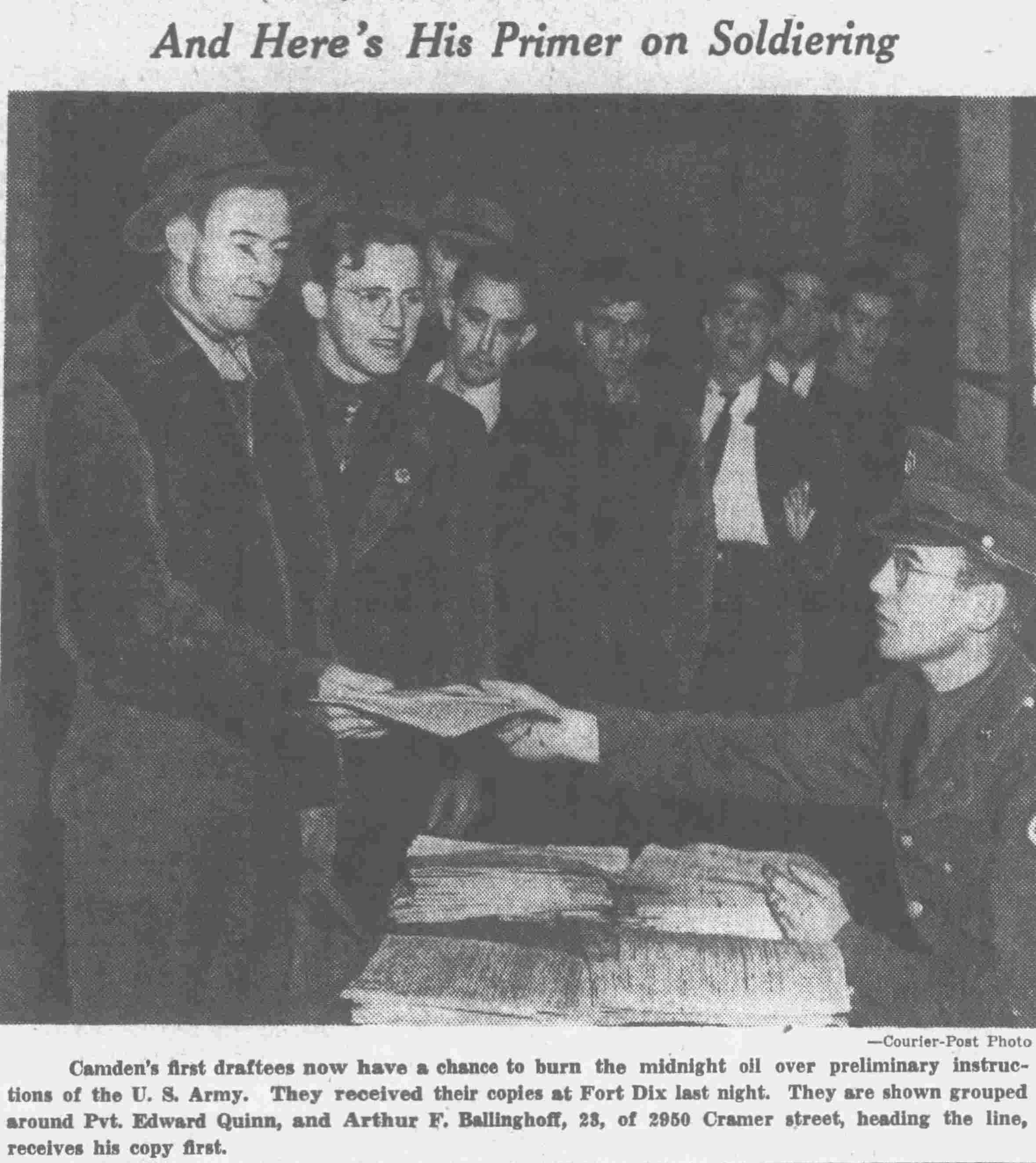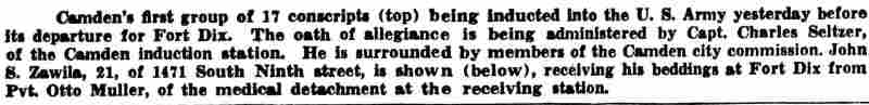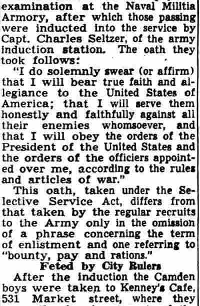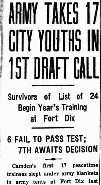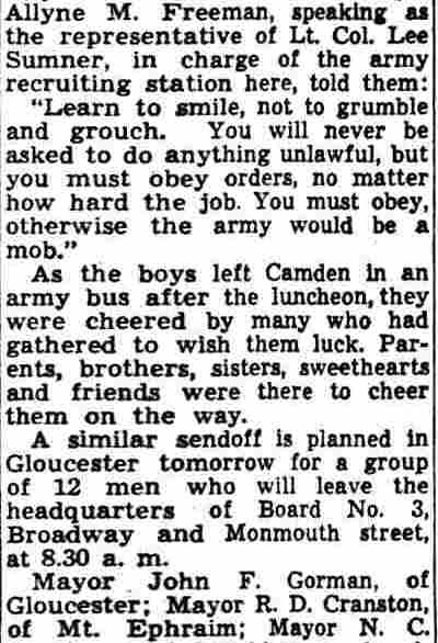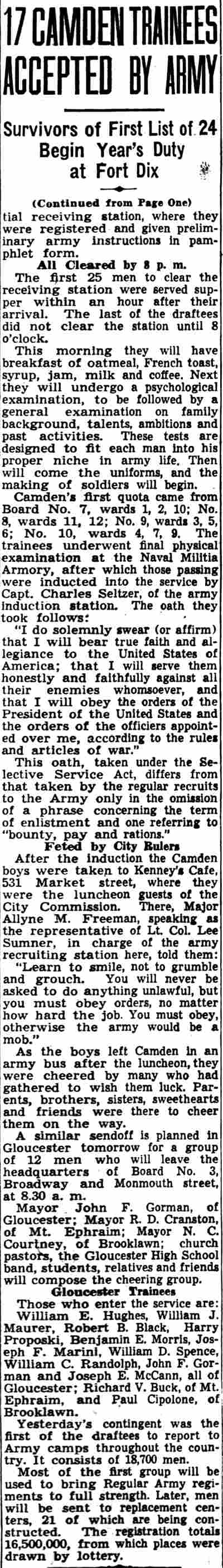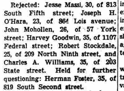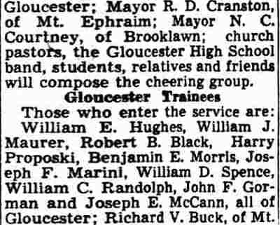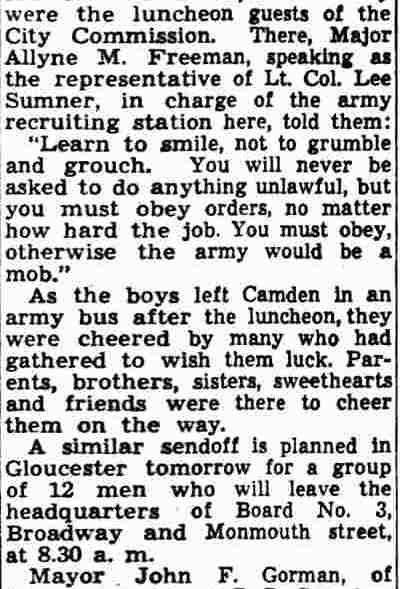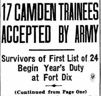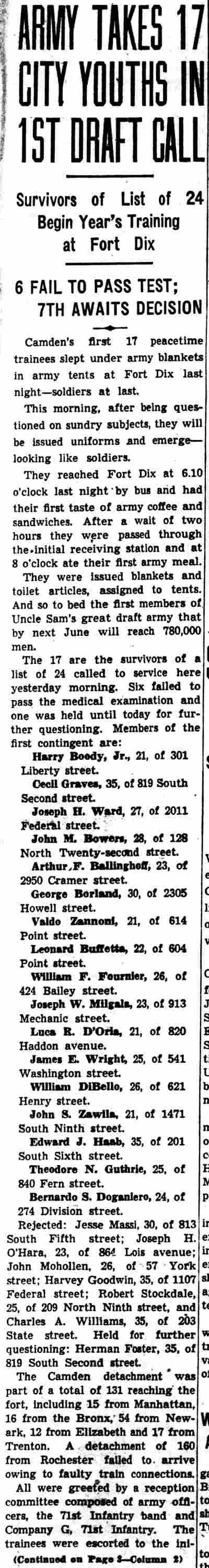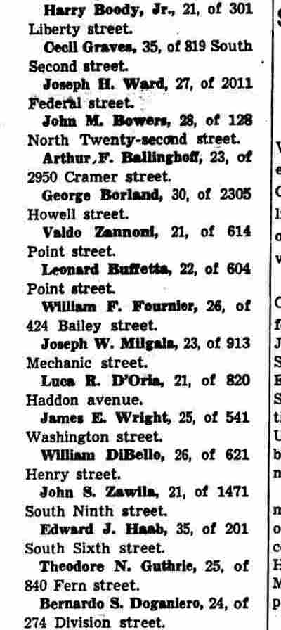 Liberty Street Cecil Graves - South 2nd Street Joseph Ward - Federal Street John M. Bowers - North 22nd Street Arthur F. Ballinghoff - Cramer Street George F. Borland - Howell Street Vito Zannoni - Point Street Leonard Buffetta - Point Street William F. Fournier - Bailey Street Joseph W. Migala - Mechanic Street Luca D'Oria - Haddon Avenue James E. Wright - Washington Street William DiBello - Henry Street John S. Zawila - South 9th Street Edward J. Haab - South 6th Street Theodore N. Guthrie - Fern Street Bernardo S. Doganiero - Division Street Jesse Massi - South 5th Street Joseph H. O'Hara - Lois Avenue John Mohllen - York Street Harvey Goodwin - Federal Street Robert Stockdale - North 9th Street Charles A. Williams - State Street Herman Foster - South 2nd Street