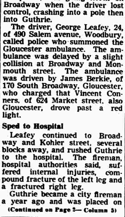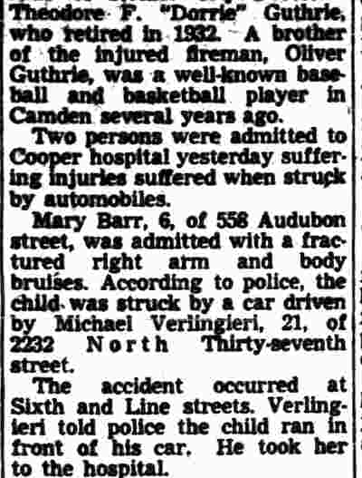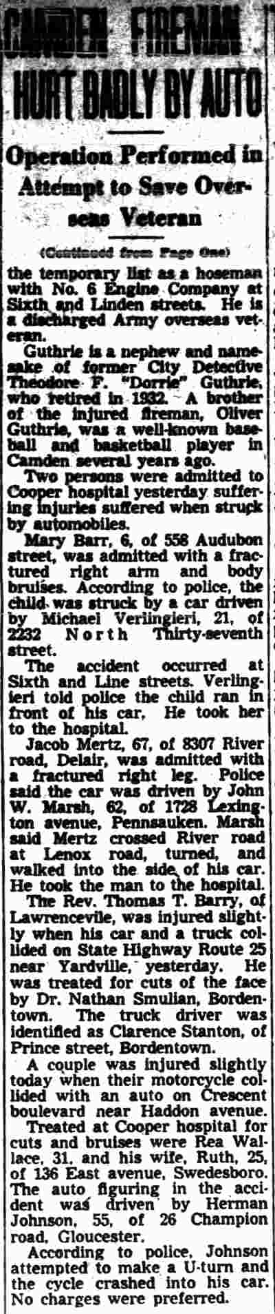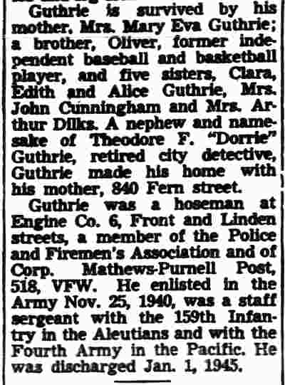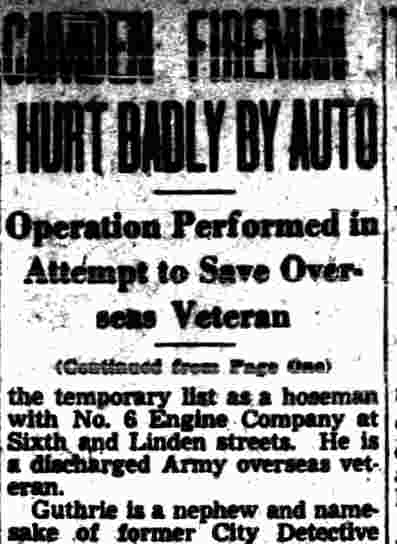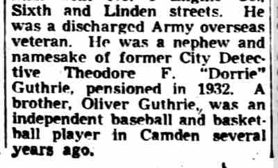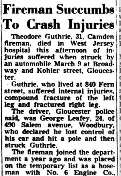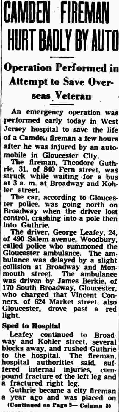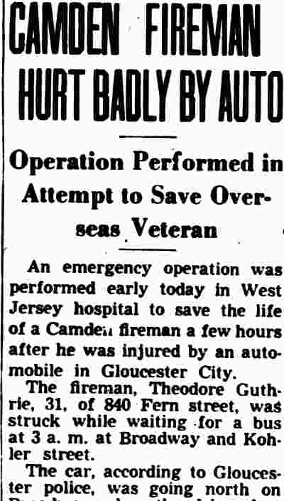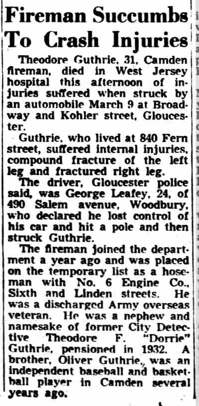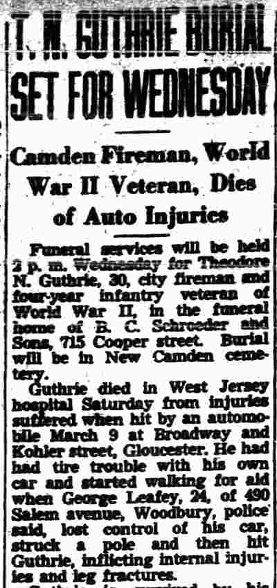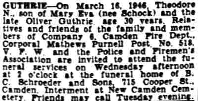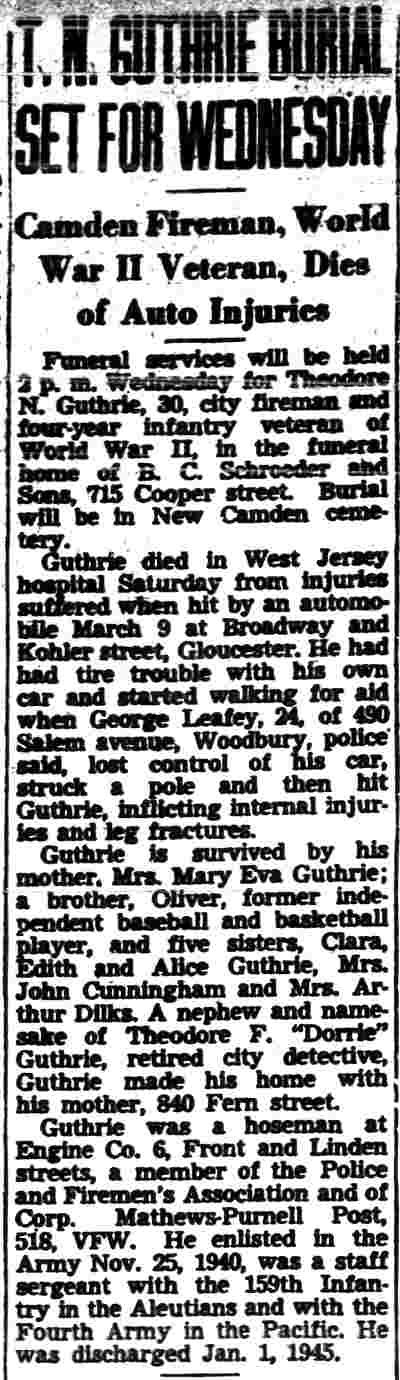 THEODORE NORMAN "NORM" GUTHRIE was born in Camden, New Jersey in 1915 to Oliver S. Guthrie Jr. and his wife, the former Mary Eva Schock. His father worked for the Pennsylvania Railroad as a detective, a very busy job given the size and number of railroad yards in the city. The family was listed at 914 South 6th Street in the 1915 City Directory. Directories and Census record from 1916 through 1920 show family at 943 St. John Street. Theodore N. Guthrie was named after his uncle, Theodore F. "Dorrie" Guthrie, who had served with the Camden Fire Department for two years before transferring to the Camden Police Department where he would serve for almost thirty. Theodore N. Guthrie was the third child, coming after Oliver S. "Ollie" Guthrie III and Clara Guthrie. A younger sister, Daughter Edith was born while the family lived on St. John Street. Shortly after the 1920 Census Oliver S. Guthrie Jr. and his family moved to 911 Fern Street in North Camden. Two more sister were born, Grace in 1921 and Betty in 1925. Sadly, on 1926 illness began to plague Oliver S. Guthrie Jr. He died on October 29, 1926 at the age of 51 and was buried at New Camden Cemetery. The family stayed at 911 Fern Street until shortly after the 1928 City Directory was compiled. By 1929 Mrs. Guthrie had moved the family to 840 Fern Street. Mrs. Guthrie and family were still there in 1946. Theodore Norman Guthrie appears in the 1930 Census as "Norman Guthrie", and he was known in his family as Norm, possibly to differentiate him from his uncle. On November 16, 1940 Theodore N. Guthrie was one of the first 17 men who were drafted into the United States Army in 1940 when the draft was re-instituted in anticipation of America's entry into World War II. He served until 1945, then returned to Camden and was appointed to the Camden Fire Department. Tragically, he was struck by a car while waiting for a bus in Gloucester and died from his injuries on March 16, 1946. Theodore N. Guthrie was buried two days later at New Camden Cemetery. |