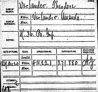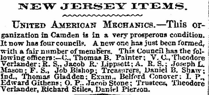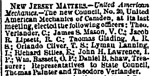 G. Meade. Stationed at Great Falls and later at Theodore Verlander received a disability discharge and mustered out on November 13, 1862. He returned to his wife and son, and brought his family to Camden, where in 1863 another son, Theodore A. Verlander was born. Two more sons came afterwards, Clarence and William. As stated above, Theodore Verlander was appointed to the Camden Fire Department to on in September of 1871. He was then making his home at 411Cedar Street in North Camden. He was dismissed from the Camden Fire Department on October 22, 1872. When the 1878-1879 City Directory Theodore Verlander was living at 815 Kimber Street. By the time the 1880 Census was taken he had moved to 615 Pearl Street, where he lived through 1884. By the following year he had moved to 804 Linden Street. He then was working as a machinist in Philadelphia. The 1887-1888 and 1888-1889 City Directories state that Theodore Verlander was residing at 210 York Street and was still working as a machinist. Theodore Verlander passed away on November 14, 1889, survived by his wife and sons Frank, Theodore, Clarence, and William. Amanda Verlander was approved for her Civil War widow's pension on December 20, 1889. Theodore Verlander was a member of the Thomas M.K. Lee Post 5, G.A.R. He was active with New Jersey Lodge No. 1, Independent Order of Odd Fellows, and he also had been a founding member, in 1868, of Council No.20 of the Order of United American Mechanics. |