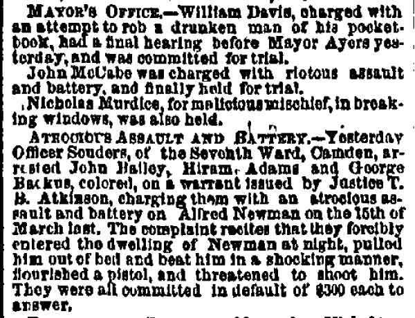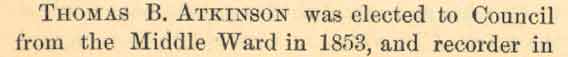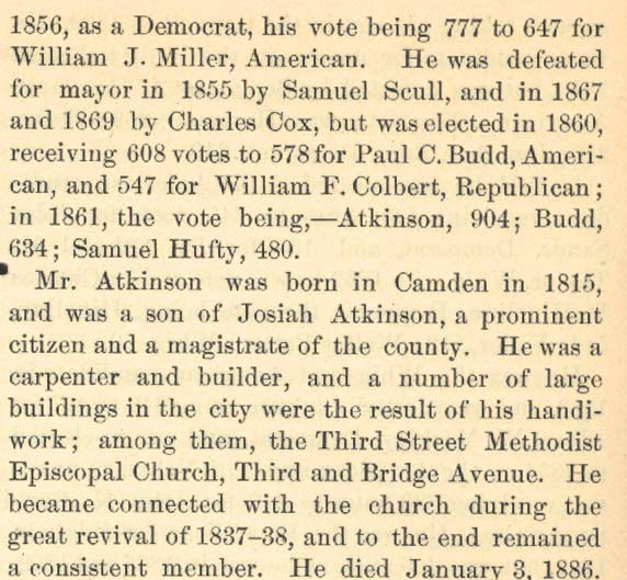 THOMAS B. ATKINSON was born in Camden in 1815. His father, Josiah Atkinson, was a prominent citizen and county magistrate. Thomas Atkinson learned the carpenter's trade, and over the years erected several large buildings in Camden. Joining the Methodist Church during the great religious revival of 1837-1838, he built the Third Street Methodist Church, which stood for many years at Third Street and Bridge Avenue. He was a lifelong member of that church from its inception. Thomas Atkinson became involved in politics as a Democrat. He was first elected to public office as a councilman from the Middle Ward in 1853, and subsequently to the office of recorder in 1856. He ran for mayor five times, in 1855, 1860, 1861, 1867, and 1869. In those days, the mayoral election was led annually. He was defeated for mayor in 1855 by Samuel Scull, and in 1867 and 1869 by Charles Cox, but was elected in 1860, receiving 608 votes to 578 for Paul C. Budd, American, and 547 for William F. Colbert, Republican; in 1861, the vote being,— Atkinson, 904; Budd, 634; Samuel Hufty, 480.. He succeeded Clayton Truax in 1860, and was in turn succeeded byPaul C. Budd as mayor. Thomas Atkinson lived in the latter years of his life with wife Martha at 23 Third Street in Camden. He passed away on January 3, 1886, survived by his wife. |