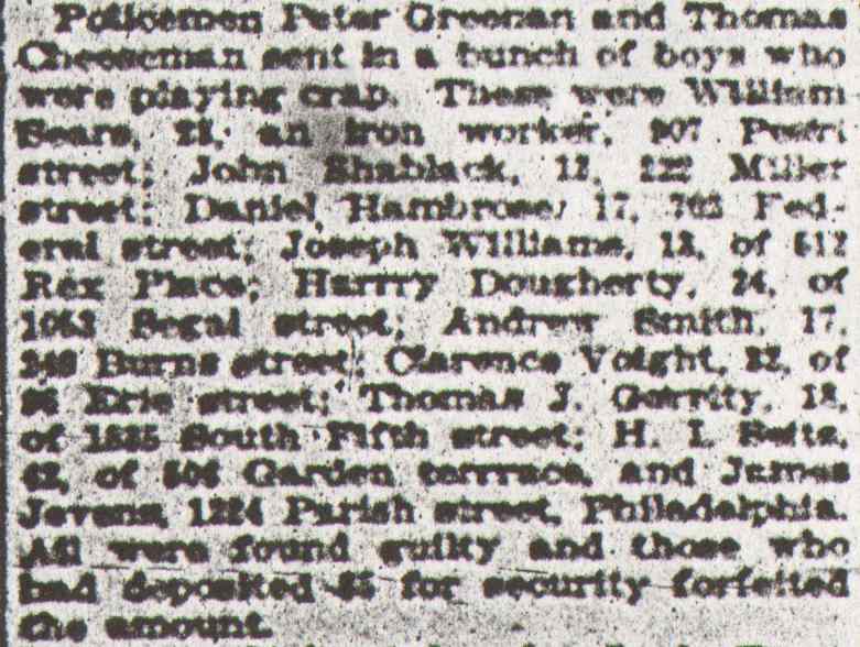 33rd Street - Harry E. Renders - Charles Luers North 2nd Street - George W. Rush - Farragut Avenue - Watson Street Joseph Benson - Charles Benson - Edward Marshman - Morse Street John Grogan - North 22nd Street - Charles Dudley - North 3rd Street Ralph Bakley - Vernon Jones - Thomas Cheeseman - Marshall Thompson George Thomas - Clinton Street - James Williams - South 2nd Street John B. Simons - Samuel Aronow - Kaighn Avenue |