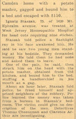 Entering a grocery store at Van Hook and Seventh Streets under the pretense of being customers, two men knocked Mrs. Mary Maska, the proprietor, to the floor this morning an robbed the cash register of $162. Recovering from the blow, delivered by one of the pair, the woman telephoned police, who immediately set up guards at the entrance to the bridge and at the ferry terminals, apparently in the belief that the thugs were from Philadelphia. The men were described by Mrs. Maska as colored, both small in stature. One was shabbily dressed, wearing a torn overcoat, she said. The other was neatly garbed. Both wore caps. The robbery occurred at 9 o’clock this morning and a1thougth Mrs. Maska screamed for help after the men had fled, no help came City Detectives George Ward and Thomas Cheeseman arrived at the scene in response to her call to police headquarters. The men entered the store; where Mrs. Maska was alone and one tendered her a quarter in supposed payment for a small quantity of bologna. This was done, detective. Believe, in order to give the men an opportunity to see the contents of the cash drawer in the cash register. In ringing up the quarter, Mrs. Maska revealed that there was a quantity of paper money in this drawer. The second of the bandits then asked for a cigar and Mrs. Maska left the cash register for another part of the store. As she did so, one of the men struck her on the head and then looted the cash till. Got Pre-War Liquor Several bottles of pre-war liquor were among the loot taken by burglars who broke Into the home of William Bonstedt, 510 Clinton Street, during the absence of the family over the weekend. In addition to the liquor, the thieves got several articles of jewelry and $20 in cash. The robbery was discovered when the family returned from the seashore last night. Mrs. Mary Gushue, proprietor of a boarding house at 423 walnut Street , reported $80 stolen from a bure au drawer. Police also discovered that the home of Wilfred Kaighn, 567 benson Street , had been entered and ransacked dur-ing the family’s absence at Pittsburgh. Until Kaighn returns, it will be impossible to determine how much loot was taken, detectives said. James O’Donnell, 31 years old, 545 Penn Street, was arrested yesterday after he was seen breaking into a tool house at Baird and Crescent Boulevards. When O’Donnell was arrested by George Zeitz , a patrolman, he was found to have in his possession a sweater he had taken from the shed which contained supplies from a build-ing operation nearby. A companion with O’Donnell escaped according to zeitz . |