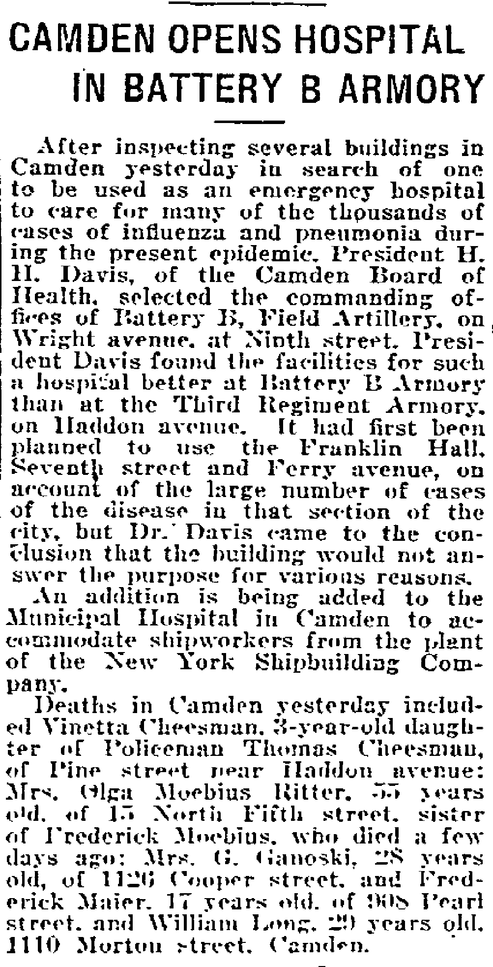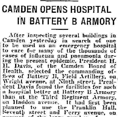 TO PROBE $200,000 KAIGHN AVE. FIRE FIRE CAPTAIN MAY DIE, FOUR OTHERS INJURED; DAMAGE IS $200,000 Economy Store and Other Buildings Near Broadway Swept by Flames Early This Morning- Falling Debris Carries Men Through Roof And Into Cellar- Sleeping Inmates of Apartments Roused and Invalid Carried to Safety- Mayor Sees Rescues Mayor Ellis has ordered an investigation to determine the cause of the $2000,000 fire which swept the properties at 427 and 429 Kaighn Avenue and caused injury to five firemen, one of whom may be fatally hurt. The fire centered about the property occupied by the Economy Store, formerly Handle’s, and quickly spread to four adjoining buildings. The fireman whose recovery is despaired of is Captain Martin B. Carrigan, of Engine Company No. 2, Fifth and Arch Streets. Carrigan, who lives at 618 West Street, is suffering from a fractured skull and severe burns and cuts of the face, legs, and body. He is unconscious at Cooper Hospital. The firemen were injured when a wall, weakened by the intense heat, crumbled and crashed through a roof upon which they were standing, dragging them through the floor below, and into a cellar. Sensational rescues followed as police, firemen, and citizens with bare hands tore at the hot debris. The men were quickly extricated and carried to the street. “We certainly shall investigate this fire,” the Mayor declared today. “Just what was the cause and who is to blame has not been determined but there will be a thorough investigation.” “There have been too many of these fires during the past few weeks” continued the mayor. “Surely all of them did not just happen and I am sure there has been someone responsible in one or two of the fires.” The conflagration was one of the most spectacular of a series of large fires that have visited the city in the past six weeks. The block in which it occurred- Kaighn Avenue between Broadway and Fourth Street is one of the most prominent business squares in Camden. Flames shot 200 feet in the air, giving the sky a fiery hue and attracted attention for miles before the firemen brought it under control. The flame-lit sky was clearly seen in Philadelphia, Merchantville, East Camden, Gloucester and other communities. More than a score of families living in the vicinity were forced to flee from their homes in scant attire when the fire threatened them. They were cared for by neighbors. Fireman George Boone, 46 years old, of Engine Company No. 2, also is in a serious condition. He is suffering from burns of the right hand, right thigh and foot and probable internal injuries. Boone lives at 607 Mount Vernon Street. The other injured foremen are: John Voll, 22 years old, 509 Royden Street: both hands badly burned. C.J. Andrus, aged 31 years, 570 Mount Vernon Street: burns of hands and legs. Harold Lorang, 29 years old, 19 Hudson Street: burns of right hand and legs and sprained ankle. Firemen Prove Heroes Carrigan and Boone are in the hospital. The other firemen were discharged after their wounds were dressed. After being released from the hospital they returned to the scene of the fire and insisted upon continuing their duties. Chief Peter B. Carter, however, ordered them home. Most of the loss was suffered by the Economy Store. A few charred walls remain of the large building. The interior was completely gutted. It was estimated today that the damage to that property will total $60,000 At least $50,000 damage, it was said, was done to the stock. Morris Handle, local theatrical man, who owns the building, declared today that the property was insured for $30,000. “My loss will be quite heavy,” said Mr. Handle. “The insurance will not pay one-half the property damage.” The adjoining building at 431 Kaighn Avenue is occupied by Dr. S.I. Yubas, optometrist, and L.R. Yubas, his father, a jeweler. Invalid is Rescued The rear and upper floors of the Yubas property were gutted and the stock sustained a heavy loss, due to water and smoke. The damage will total $40,000, Mr. Yubas estimated today. Five persons who were asleep on the upper floors of the Yubas dwelling had narrow escapes. They were awakened by Samuel Goldstein, haberdasher, 417 Kaighn Avenue, who discovered the fire in the Economy Store and turned in the alarm. Mrs. L.R. Yubas, an invalid, was rescued with difficulty. The property occupied by Mrs. Sadie Bodner, a widow, at 433 Kaighn Avenue, as a house furnishings store, was scorched and also damaged by water and smoke. Adjoining the Economy Store on the west at 425 Kaighn Avenue is a vacant one-story structure, formerly occupy by the United Beef Company. Firemen were on the roof of that building when the west wall of the Economy Store collapsed. The wall tumbled down on the small roof and hurled the firemen through a hole in the roof, through the floor and then into the cellar. Several Stores Damaged Three policemen, joseph sparks, Thomas Cheeseman, and George Hill- and several spectators braved the fire and smoke to rescue the trapped firemen. The property at 423 Kaighn Avenue, occupied by the Charles Jamison Department Store, was damaged in the rear and the stock ruined by water and smoke. The Kresge Five-and-Ten-Cent Store, at 519-531 Kaighn Avenue, was also damaged by water. Louis Richelson, who owns the properties from 519 to 525 Kaighn Avenue, was unable to estimate his loss today. Collapse of Wall Hundreds of spectators, who were watching the fire from the opposite side of the street, shuddered as they saw a brick wall, weakened by the intense heat, totter and sway. Before the firemen on the smaller roof below could scurry to safety, it collapsed. A groan escaped the crowd as they heard the cries of the entrapped firemen and the deafening thud of the brocks as they landed on the roof where the firemen were at work. As the full weight of the brocks struck the roof, it caved in forming a gaping hole. The firemen were literally swept into the opening. The bricks tumbled down, causing an