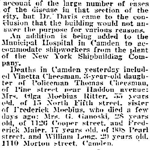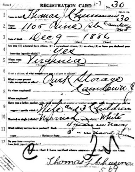 THOMAS J. CHEESEMAN JR. was born on December 9, 1886 to Thomas and Bernice Tomlin Cheeseman. He was the second child, coming after sister also named Bernice. The family was living at 650 Locust Street in Camden NJ when the 1900 census was enumerated. By this time Thomas Cheeseman Jr. had already left school, to work as an operator at a woolen mill. By 1910 Bernice Cheeseman had passed away. Father Thomas Sr. was by then a building contractor. When the census was taken in 1910, the family was living on Zimmerman Avenue in the Delair section of Pennsauken NJ, just off of River Road. Thomas Cheeseman Jr. had married by this time. His wife Emma, then 16 was pregnant with their first child, a son, who was born in September of that year. Also at home were sisters Mabel and Emma, and his 84 year old maternal grandmother, Luanna Tomlin. Thomas and Emma Cheeseman had moved to Camden by 1914. The family then lived at 1052 Line Street. Thomas Cheeseman Jr. then worked as a boilermaker. By June of 1917 when he registered for the draft, Thomas Cheeseman had previously served four years in the United States Navy and had been a member of the Naval Reserve for three years. At the time of the draft, Thomas Cheeseman Jr. was the father of three children. He was then working as a laborer for the Park Moving and Storage Company, and was living in a rented house at 1105 Pine Street with his wife Emma and children Thomas III, Lillian, and Vinetta. Sadly Vinetta died in October of 1917 during the flu pandemic. Another daughter, Margaret, was born around the same time. The Cheesemans remained at the Pine Street address through at least January of 1920. By January of 1920 Thomas Cheeseman Jr. had become a member of the Camden Police Department. He was promoted to Detective in the mid-1920s. In this capacity his name regularly appeared in the newspapers of the day. At some point in the 1920s Thomas and Emma Cheeseman divorced. By 1929 he had remarried and was living at 718 Spruce Street with his then-wife Edith and two step-sons, Raymond and Grant Wiley. In 1934 Thomas Cheeseman was indicted on bribery charges. He was convicted and served a short sentence in jail. After his release he moved to Cape May County. Thomas Cheeseman Jr. was last a resident of Green Creek, in Cape May county, New Jersey. He passed away in July of 1971. He was survived by his son, Thomas Cheeseman, who remained a Camden resident until his passing in March of 1981. |