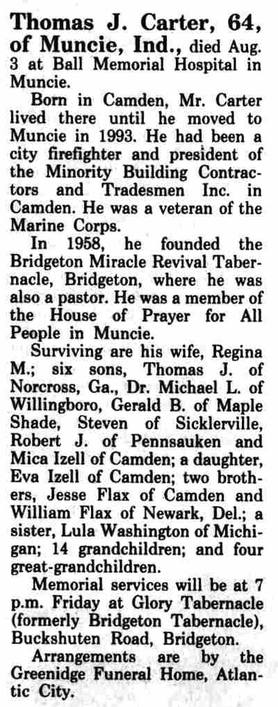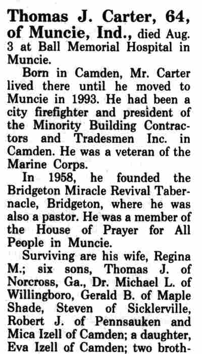 J. CARTER was born in Camden on March 24, 1930 to Thomas J.