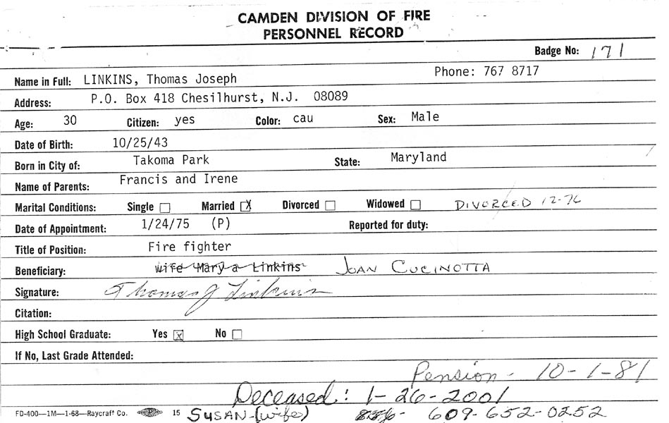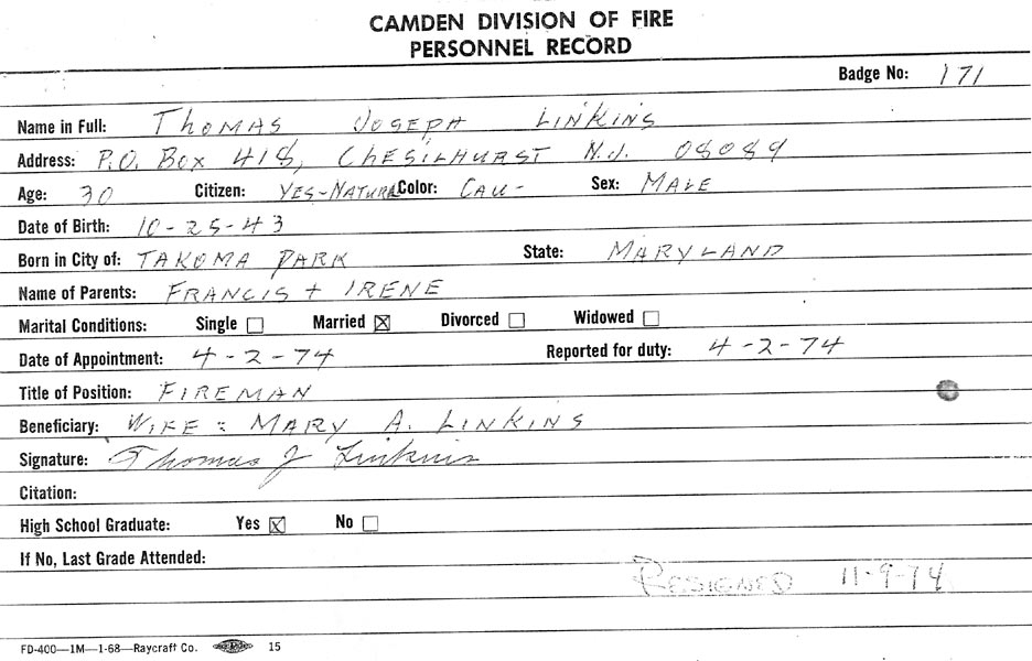 THOMAS JOSEPH LINKINS was born in Takoma Park, Maryland on October 29, 1943 to Francis and Irene Linkins. He was appointed to the Camden Fire Department on April 2, 1974 and served until October 1, 1981 when he retired on pension. He was living in the Chesilhurst, New Jersey area when he retired. Thomas Linkins later moved to Absecon, New Jersey. He passed away on January 26, 2001. A Thomas Linkins was a member of the New Jersey State Marine Police in December of 1970, serving in the vicinity of Barneget Bay. It was reported in the Bucks County Courier Times in ember of 1970 that he was a two-year veteran of that organization. This very well may have been the same Thomas Linkins who later served with Camden's Fire Department. |