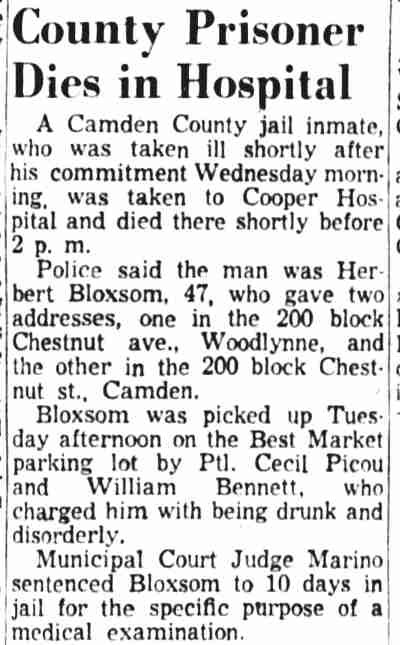 HEART ATTACK FATAL TO MAN IN HOTEL HERE Henry F. Wilson, about 65, of Unionville, Pa., dropped dead of a heart attack last night at the Lenox Hotel, 22 Market street. He was taken to Cooper Hospital and pronounced dead. Detectives Thomas Murphy and Gus Fortune are attempting to locate relatives of the man. |