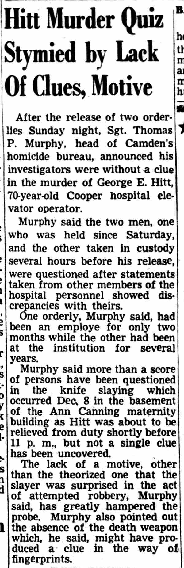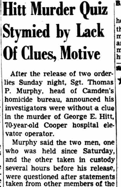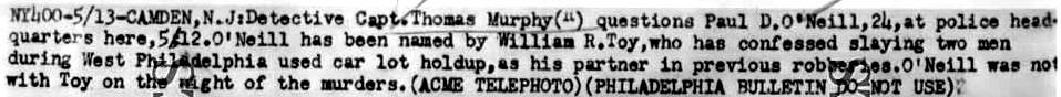 THOMAS P. MURPHY was born May 23, 1897 in New Jersey to Thomas J. Murphy and Anna Murphy. His father was a member of the Camden Police Department, serving for over 30 years beginning in August of 1902.. The Murphy family in January of 1920 was living at 705 North 2nd Street in North Camden. The elder Murphy was a member of the Camden Police Department. Thomas P. Murphy, who had not joined the force yet, was working as a machinist. Besides Thomas P., there were four other children, sister Frances and brothers William, Steven, and John. Sadly, Stephen Murphy died on November 24, 1922 of pneumonia at the age of 18. The 1930 Census shows the Thomas P. Murphy residing with his parents at 545 Vine Street in North Camden. Also at home was older brother William, an accountant at the Victor Talking Machine Company, and younger brother John, who also worked there, as a clerk. Thomas P. Murphy and his father were then working as policemen when the census was taken in April of 1930. The elder Murphy had by then been promoted to Sergeant. He retired on January 1, 1933. In 1934 Thomas Murphy was promoted to acting detective. He was instrumental, in August of that year, in solving the Haddonfield murder of Curtis W. Dobbins, which resulted in the conviction and execution of William J. Stephan. He was officially promoted to detective on August 19, 1937. The 1947 Camden City Directory shows that Thomas Murphy had been promoted to Sergeant, and was still working in the Detective Bureau of the Camden Police Department. He was then living at 417 Cooper Street, where he resided there throughout the 1950s. In December of 1949 Thomas Murphy was chosen to lead the newly formed Homicide Bureau, and was given Detective Sergeant William Marter, and Detectives Harry Tracy and Vincent Conley to work with, He was promoted to Captain on May 30, 1951. In 1955 he received his last promotion, to Inspector. He led Camden's detectives throughout the 1950s until his retirement in 1958. Thomas Murphy passed away in August of 1969. |