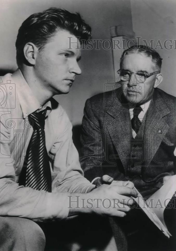 Anthony Carrozza, 209, of 1021 Wolf Street, Philadelphia, is shown standing between Detectives Thomas Murphy, left, and August Fortune behind the $389.64 he planned to take from fellow employees by telling them he had been kidnapped and robbed after cashing their pay checks. |