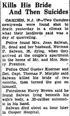 A difficult case that Detective Captain Murphy investigated in 1953 was that of the tragic suicide of James S. Wilkie, son of a veteran Camden police officer, John V. Wilkie. For several days after the shooting, Sgt. Wilkie claimed that he had shot his son, in order that he receive a Catholic funeral. He retracted his confession after it became apparent that he could not deceive the city and county investigators, and was released after the grand jury refused to return an indictment. This tragic case saw the involvement of many of Camden's law enforcement and legal community, including Benjamin Asbell, Mitchell H. Cohen, Wilfred Dube, James J. Mulligan, J. James Hainsworth, Samuel P. Orlando, John Healey, and Joseph Bennie, among others. |