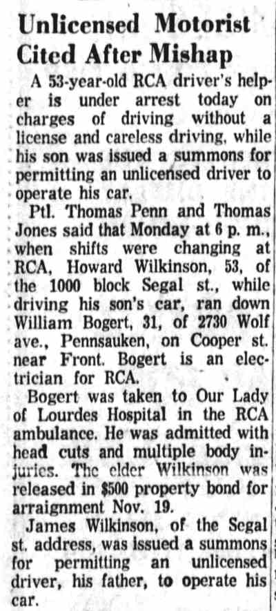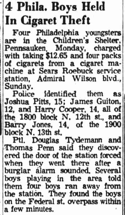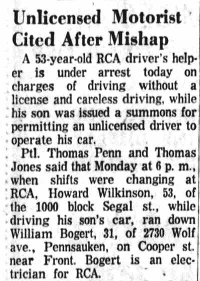 THOMAS PENN joined the Camden Police Department in the 1958, and was serving as a motorcycle office by September of 1960. When he was appointed to the police department he was living at 241 Mount Vernon Street in South Camden. He was living at 71 South 27th Street in East Camden in the early 1960s. Sadly, Patrolman Penn passed away at a very early age, sometime in the mid-1960s. He was survived by his brothers Dennis M. Penn and Kenneth L. Penn, both of whom served on the Camden Fire Department. |