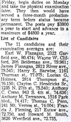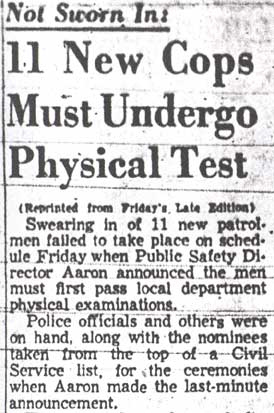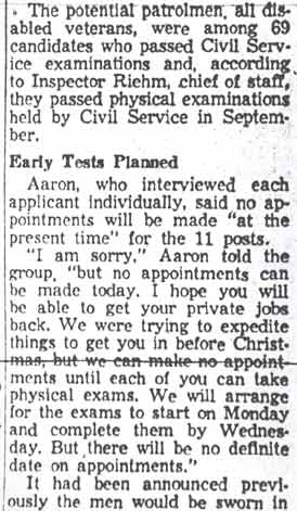 Medical Report: 7 of 11 Slated For Cops Jobs Fail in Tests Seven of the 11 men awaiting swearing in as new Camden patrolmen have failed to “come up to medical requirements,” Director of Public Safety Aaron announced Friday. Aaron said he would not release the names of the seven men until he has an opportunity to confer Monday or Tuesday with State Civil Service Authorities. The 11 were among 69 candidates who passed Civil Service examinations for patrolmen, including medical and physical tests. Remain on Lists However, before they were to be sworn in on December 13, Aaron announced he was delaying the ceremony until complete medical examinations could be made by Dr. Garnett Summerill, city police and fire surgeon. Dr. Summerill, Aaron said, reported to him that only four of the 11 met all medical requirements. “The next step will be up to the State Civil Service.” Aaron said. “I will send the state a complete report and ask them to check their physical reports, and I intend to go to Trenton either Monday or Tuesday to talk with the Civil Service officials.” CS Decision Paramount Wayne Boyd, director of examinations for Civil Service, told the Courier-Post the fact the men did not pass the city’s medical examination does not remove them from the list of eligibles. “Only the Civil Service can put the candidates on the list and only Civil Service can take them off,” Boyd stated. “We will review the cases and it may be the men will be reexamined by our doctors. We gave two examinations, one a medical checkup and the other a physical test in which each person is required to do nine events such as knee bends, bending over, pushups from the floor, etc.” All Disabled Veterans “If we find the doctors cannot agree, then a neutral outside specialist may be called in to make a decision would be final as far as Civil Service is concerned.” The 11 candidates for the patrolmen posts which start with the salary of $3800 and advance to a maximum of $4800 are: Earl W. Flanagan, 2323 Garfield Avenue; Wayne W. Clifford, 205 Beideman Avenue; James Flanagan, 2821 River Avenue; Harry E. Barwise, 1161 Thurman Street; Lucian G. Homes, 2842 Thompson Street; Clayton C. Hendricks Sr., 1235 North 27th Street; Anthony C. Como, 943 South 4th Street; Anthony M. Terranova, 1516 Park Boulevard; Thomas C. Penn, 241 Mount Vernon Street; Francis J. Fleming, 217 Eutaw Avenue; and Howard M. Smith, 3620 Westfield avenue. All are classified as disabled veterans. |
