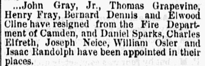 On October 9, 1872 Thomas Grapevine was appointed to the Camden Fire Department as a member of Engine Company 2, replacing Joseph Nece Sr., who had resigned. Thomas Grapevine served until July 15, 1873 when he and two other men from Engine Company 2, Bernard Dennis and Henry Frost, were dismissed from service. Thomas Grapevine returned to Engine Company 2 on February 3, 1874, taking the place of William H. Osler, who had been promoted to Engineer. Thomas Grapevine served with Engine Company 2 until April of 1876, when incoming Chief Claudius W. Bradshaw made wholesale changes in department personnel. Thomas Grapevine was replaced by William Stanton.