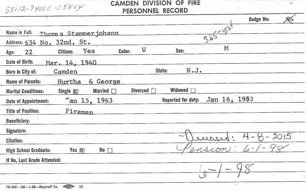 served with the US Navy from 1957 to 1960. He retired in 1998 from Engine 3 as a Captain