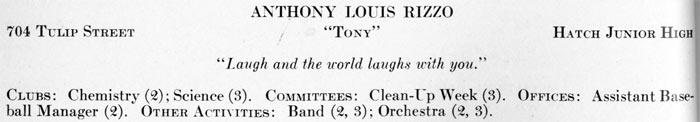 ANTHONY LOUIS "TONY" RIZZO grew up in Camden NJ, where he attended Cooper B. Hatch Junior High School, Camden County Vocational School, and graduated in 1940 from Woodrow Wilson High School on Federal Street in East Camden. The Rizzo family lived at 714 Tulip Street during the 1930s and 1940s. After serving in Europe during World War II, he returned to Camden, worked at the New York Shipbuilding Corporation shipyards while attending Drexel on the G.I. bill. After graduating with a degree in engineering he found work with Hughes Aircraft in California, where he had a long and successful career. Robert Stanton, a classmate and lifelong friend, wrote an article about Tony Rizzo, which he sent to me in May of 2006. |