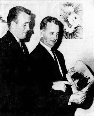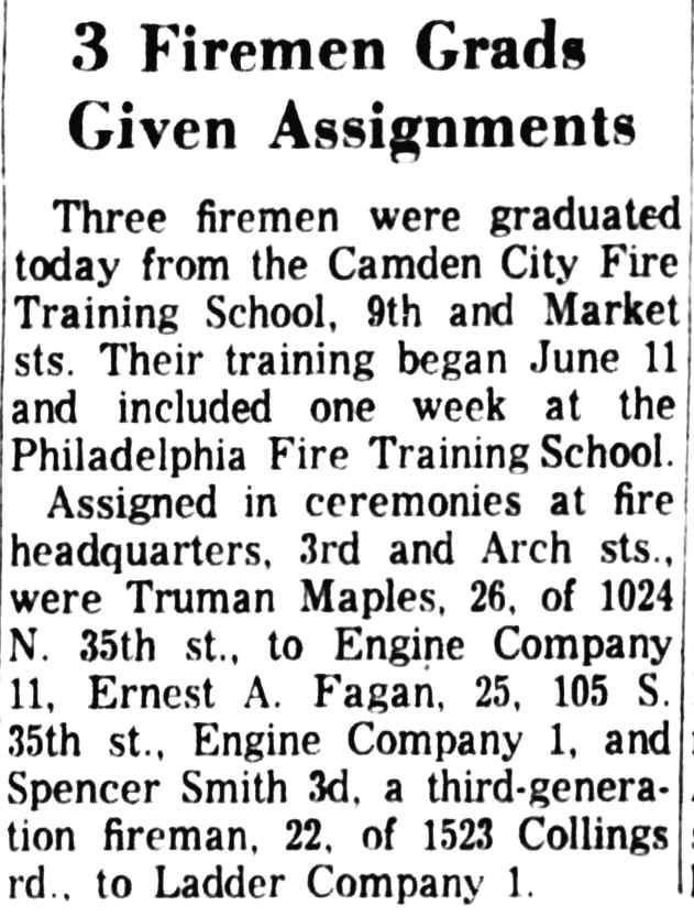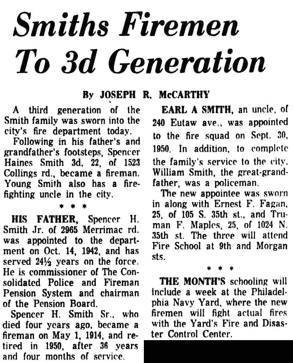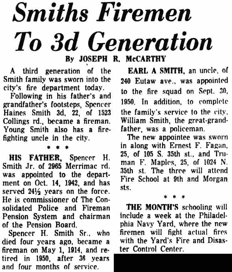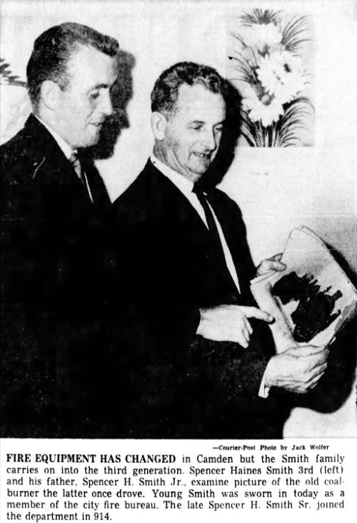 FIRE EQUIPMENT HAS CHANGED in Camden but the Smith family carries on into the third generation. Spencer Haines Smith III (left) and his father Spencer H. Smith Jr., examine picture if the old coal-burner the latter once drove. Young Smith was sworn in today as a member of the city fire bureau. The late Spencer H. Smith Sr. joined the department in 1914.