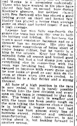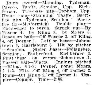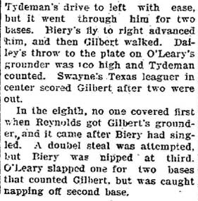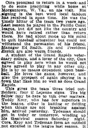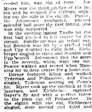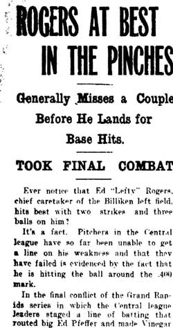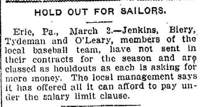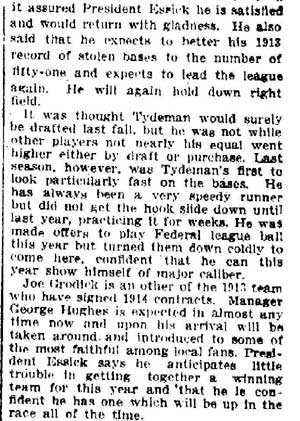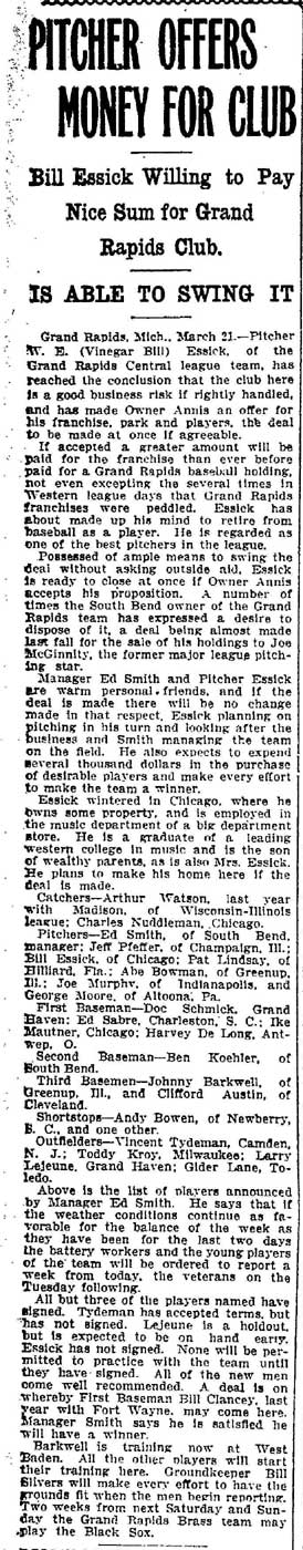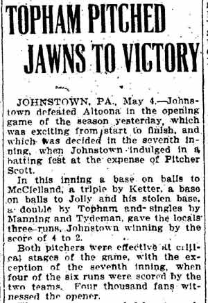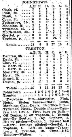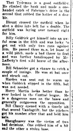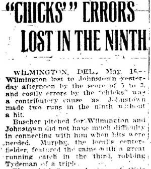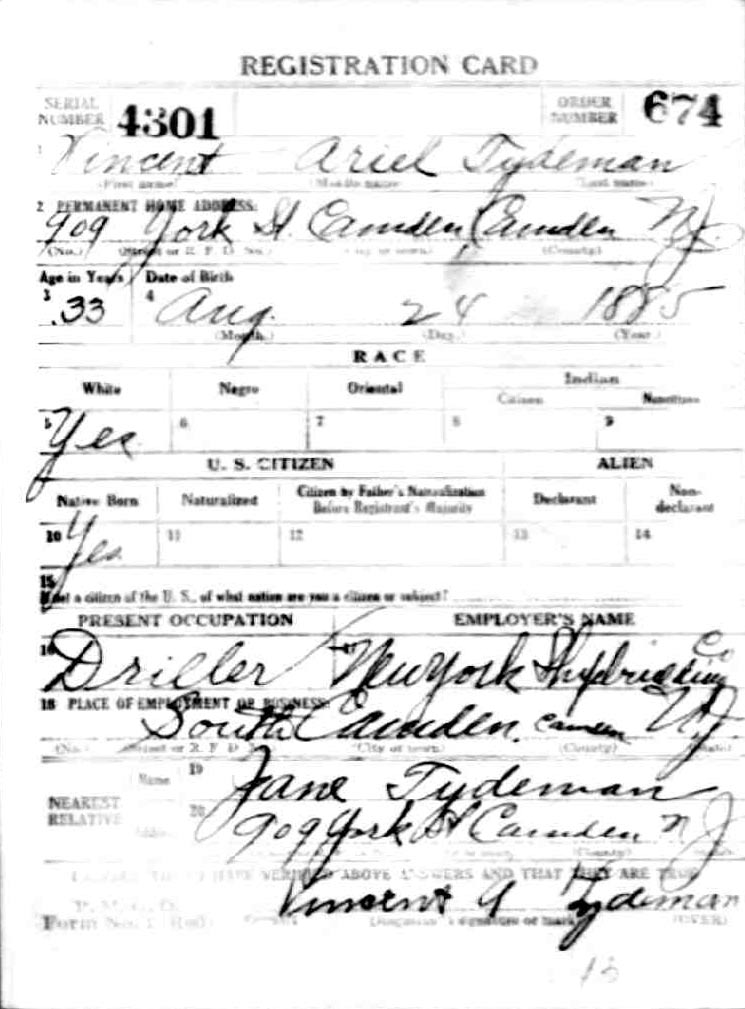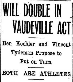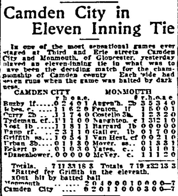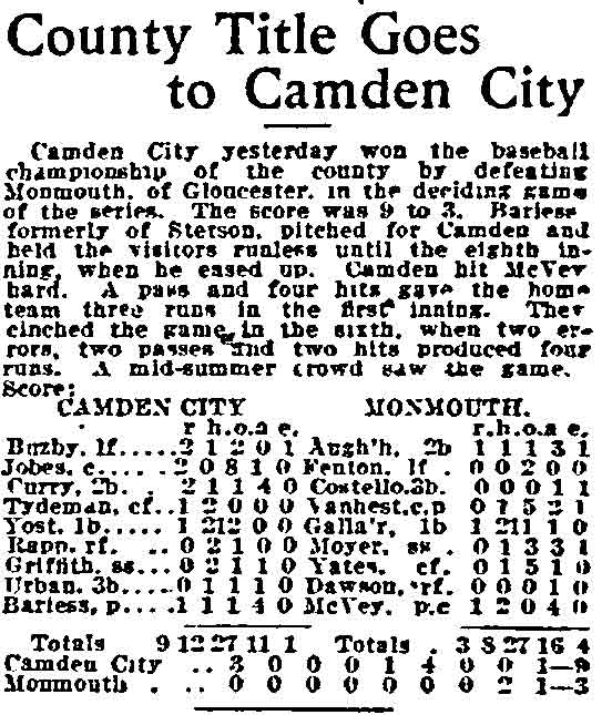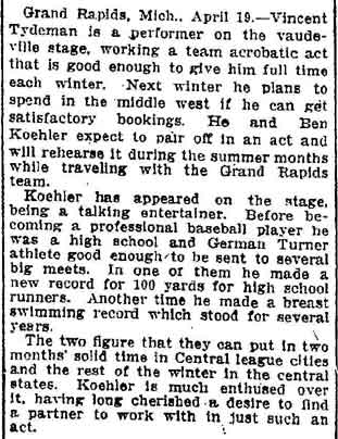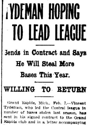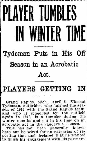 VINCENT ARIEL TYDEMAN was born in New Jersey on August 24, 1883 to Edmund and Sarah Tydeman, who had come to America from England in 1878 with their nine children. Another child, Florence, was born just before the June 1880 census. Edmund Tydeman, the oldest son of a Baptist minister, was an optician who had brought his family to Camden from Pennsylvania after daughter Florence was born in April of 1880. The 1887-1888 Camden City Directory shows the family living at 1046 Cooper Street. The following year's directory has them at 523 Spruce Street. The family lived at 512 Bailey Street when the census was taken in 1900. At home was older brother Herbert, sister Florence, and Vincent Tydeman, the youngest child. Vincent Tydeman was a superb athlete, excelling at acrobatics, track and field, and baseball. He parlayed these skills into a successful career in vaudeville and professional baseball in the 1900s and 1910s. He was of a generation of North Camden children who went on to become notable stage performers. His contemporaries included dancer Ann Pennington and the Dooley Family. Vincent Tydeman teamed with Johnny Dooley for three years, their act, Tydeman & Dooley was very popular. The pair worked together for three years before parting ways. His great-granddaughter, Maryann Foster, writes: Vincent Tydeman learned his acrobatic routine from an ex-vaudeville clown named Charlie Sheldon who had moved to Camden from Wilmington in 1903. My great-grandfather practiced his routine of back flips and running leaps under Sheldon's direction out at Old Coxey Farm near the State Street Bridge. It was during this time that he mastered his legendary trick of making a running dive over seven chairs into a handstand on a table and then a return leap over five more chairs. It was this trick that made him the most sensational and highest paid acrobat on the Keith Vaudeville Circuit. He traveled for weeks at a time doing this act from coast to coast. Vince won the Camden All-around Championship at the Camden YMCA in 1903, 1904, and 1905. He was also the Camden County Pole Vaulting Champion in 1905. In 1905 the Tydeman and Dooley act played at the Broadway Theatre on Broadway and Sycamore Streets to sold-out shows both matinees and evening performances. My great-grandfather was the straight man and originator of the act. His partner Johnny Dooley lived in Camden between North 2nd and North 3rd Street on Pearl Street. The act lasted for three years when they then parted professionally. Vincent Tydeman married around 1906. He also was playing professional baseball that year, first with Savannah in the South Atlantic League, then with Valdosta GA in the Georgia State League. When the team folded in July of that year, he was assigned to the Orangeburg SC franchise. He signed a contract to play for the Paterson NJ franchise of the Union Baseball League in April of 1908. By 1904 Edmund Tydeman had passed away. The family made its home at 228 Burns Street in the Poet's Row section of North Camden in that year. Vincent Tydeman later made his home at 106 Elm Street in North Camden with his wife Jennie, daughter Alice, son Robert and his 70 year old mother. During the fall and winter months of the 1910s, Vincent Tydeman played on the B.F. Keith vaudeville circuit, usually as part of the comedic acrobat team of Tydeman and Dooley. Another young North Camden neighbor, Dan McConnell was working for the Keith circuit as a publicist and breaking into journalism during these years. The 1910 baseball season saw Vincent Tydeman playing for teams in Danville and Norfolk in the Virginia League. The following year he was with Johnstown PA and Erie PA Sailors in the Tri-State League. He returned to Erie the following year. In 1911 the Erie Sailors moved to the Ohio-Pennsylvania League. Vincent Tydeman was managed by Billy Gilbert, former major leaguer and starter at second base on the 1905 New York Giants world series' winning team. Erie joined the Central League the following year. After holding out for a better contract at the beginning of the 1912 season, Vincent Tydeman was dealt the Grand Rapids MI team in the Central League. Here he enjoyed great success. In his first year in the Central League he batted .287 and stole 30 bases in only 97 games. 1913 was a banner year for Vincent Tydeman. He hit .299 with 86 runs scored. His 51 stolen bases led the circuit, and he was second in the league in home runs, with 13, a good number in the dead ball era of baseball. He also led the league in total bases with 254. The Grand Rapids won the Central League pennant by 15 games. The team was owned by its star pitcher, Bill Essick, who would also manage it to Central League pennants in 1916 and 1917. Essick would remain in baseball as a minor league manager and scout until 1951, and is remembered as the scout who signed Joe DiMaggio. He also signed Bob Meusel, Tony Lazzeri, Lefty Gomez, Frank Crosetti, Jimmie Reese, Lyn Lary, Myril Hoag, Joe Gordon, Johnny Lindell and Ralph Houk. Dimaggio, Lazzeri, and Gomez, are in baseball's Hall of Fame, and a good argument can be made for Bob Meusel and Joe Gordon. A Grand Rapids teammate in 1913 was Jeff Pfeffer, who went on to win 158 games in the major leagues with Brooklyn, the St. Louis Cardinals, and Pittsburgh. Great-granddaughter, Maryann Foster, writes: My Great grandfather played the vaudeville circuits during the winter months and played baseball during the summer months. A professional baseball scout did come out once to see my great-grandfather play but he made Vince so nervous that he didn't play his best game and never made it into the big leagues. Vincent Tydeman returned to Grand Rapids in 1914, then spent 1915 and 1916 with the Topeka, Kansas team in the Western League. He returned to the Central League for the 1917 season with the South Bend, Indiana Benders, but hit only .201. He finished the season with the Scranton Miners of the New York State League. Vincent Tydeman got off to