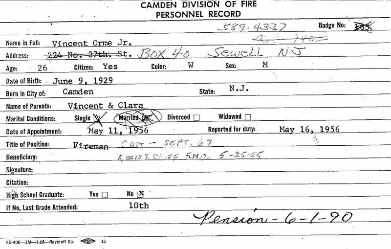 ORME was born in Camden, New Jersey on June 9, 1929 to Clara and