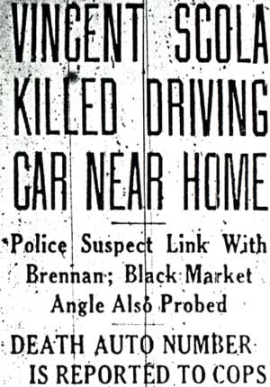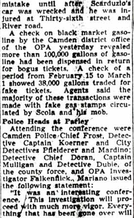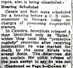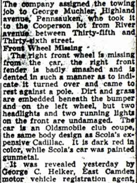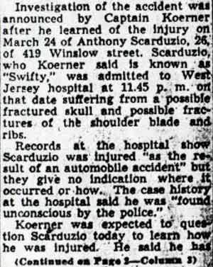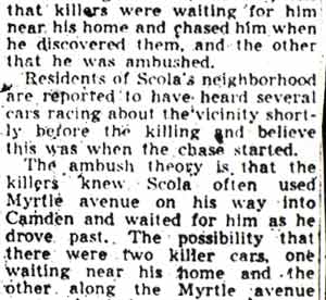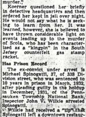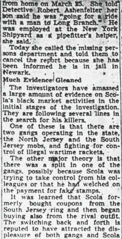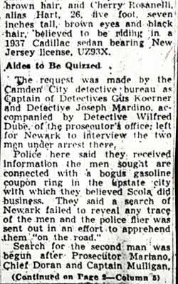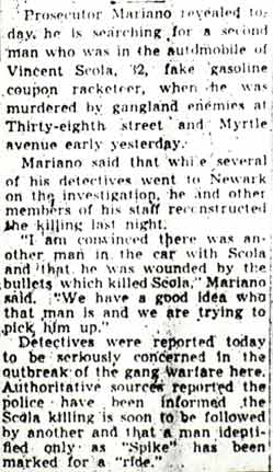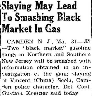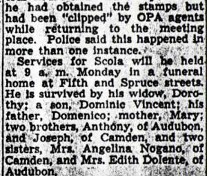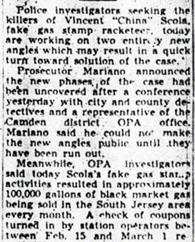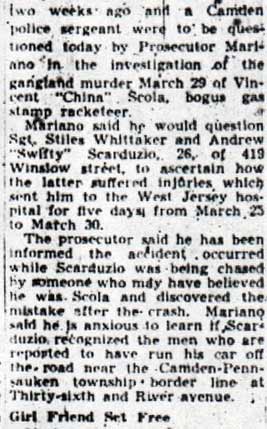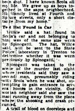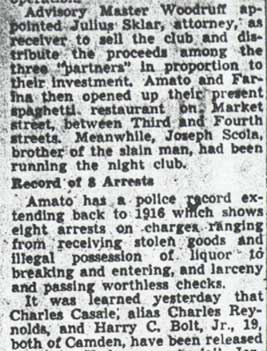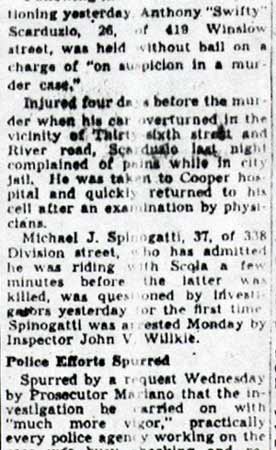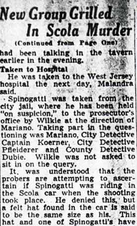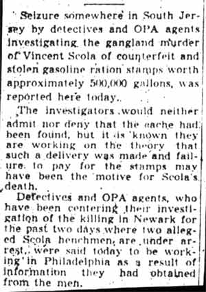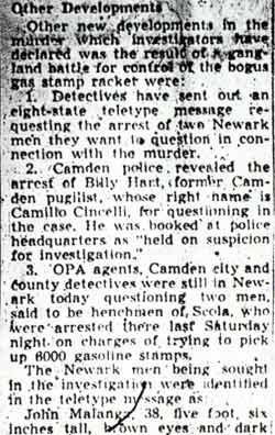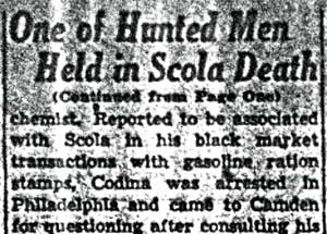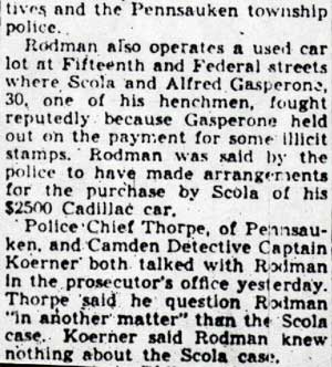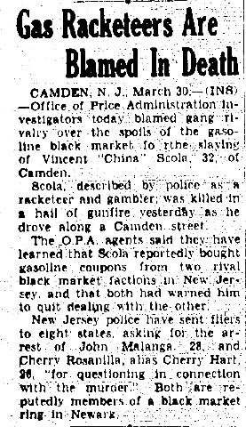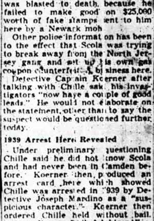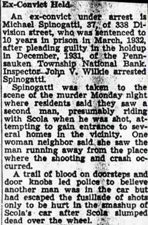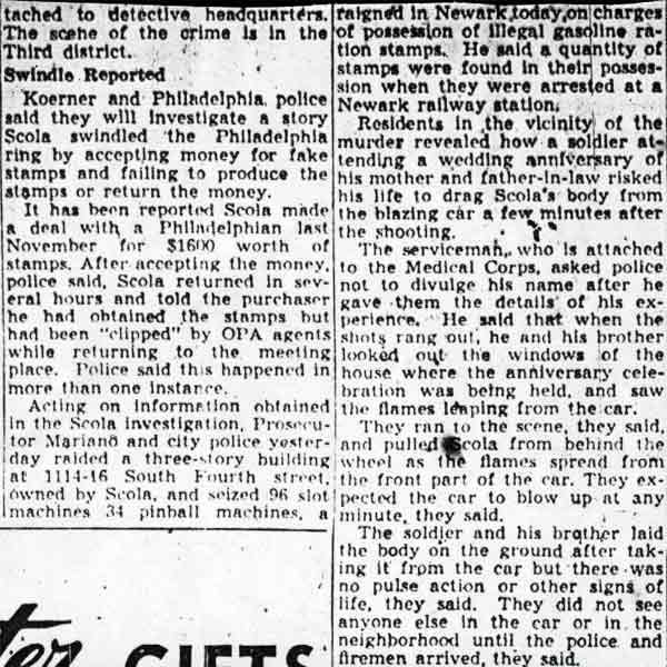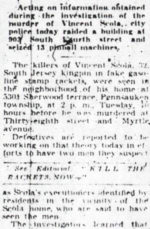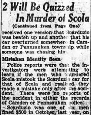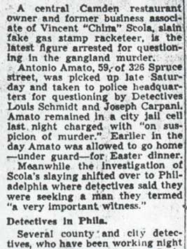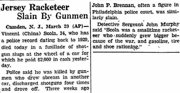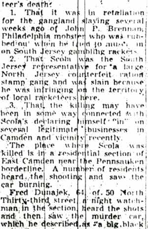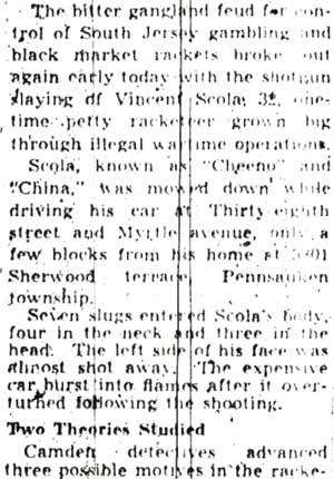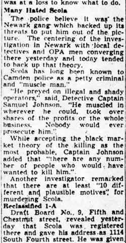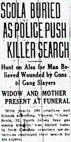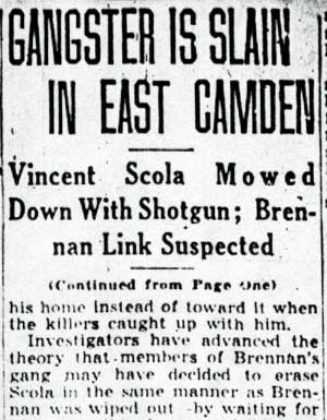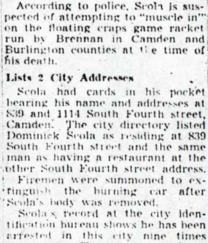 VINCENT SCOLA was born in 1911, the oldest son of Domenico and Maria C. Scola. At the time of the 1920 Census the Scolas were living at 347 Spruce Street, Domenico Scola then working as a construction laborer. By April of 1930 the Scola family lived at 839 South 4th Street, the corner of South 4th and Spruce Streets, where Domenico Scola owned and operated a candy store. Beside Vincent the family at that time included Tony, 14 Joseph, 13, Angeline, 12, and Edith, 10 years of age. Two doors down, at 835 South 4th Street lived the Tenerelli family. The Tenerelli boys, Michael and Frank, boxed professionally as mickey blair and Frankie Blair. Mickey Blair's life outside the ring would follow a pattern similar to that of Vincent Scola. Vincent Scola, also known as "Cheeno" and "China", was first arrested in 1929. By April of 1944 he had been arrested on nine separate occasions in Camden, on charges that included robbery, carrying concealed deadly weapons, suspicion for investigation, assault, possession of stolen goods, crap shooting, interfering with police officers, failure to carry a draft card, and possession of automobile tires, an offense during the World War II years. Apparently he evaded successful prosecutions in all of these cases. Crime was paying off for Vincent Scola, and he had moved out of Camden, to a home at 5301 Sherwood Terrace in Pennsauken NJ with his wife Dorothy. He also owned and operated a restaurant at 1114 South 4th Street. Vincent Scola was suspected of being involved with the wartime counterfeit gasoline rationing stamp racket when he was gunned down while driving his Cadillac at 38th and Myrtle Streets in East Camden. Struck by a shotgun blast to the neck and head, his car went out of control, overturned and burst into flames. The Scola case was front page news in Camden for two weeks. Various theories as to why he was murdered were put forth, including that he had been attempting to muscle in to gambling in Camden and Burlington counties, and he was killed in retaliation for the murder of Philadelphia gangster John P. Brennan, who had attempted a similar power grab in Camden several weeks earlier. It is worth noting that another former South Camden boxer,Rocco "Roxie Allen" Auletto, was working for Brennan as a bodyguard when he was gunned down. Vincent Scola was buried at New Camden Cemetery on Haddon Avenue in Camden. He was survived by his wife, who joined him in 1966, his parents, and siblings. Several suspects were questioned, and the cycle of gang-related violence did not end with Vincent Scola's murder. |