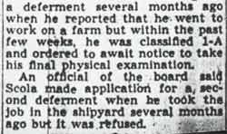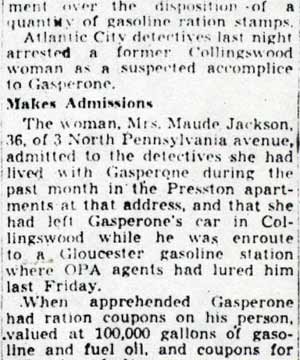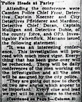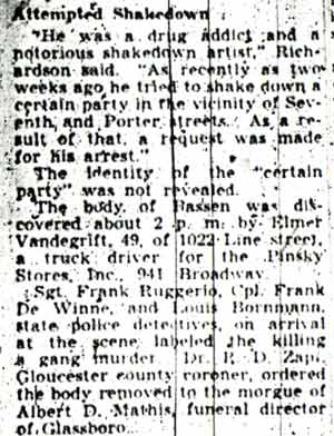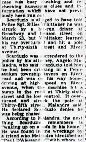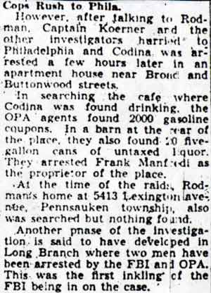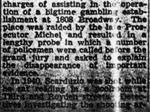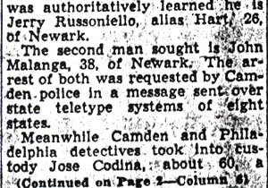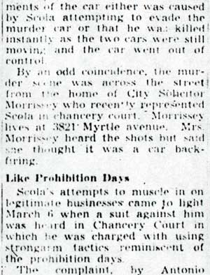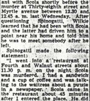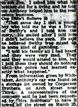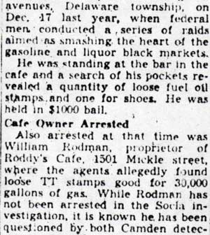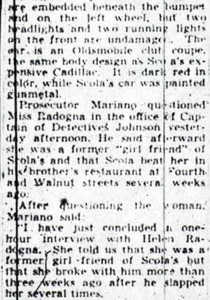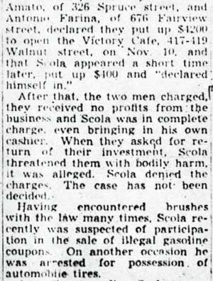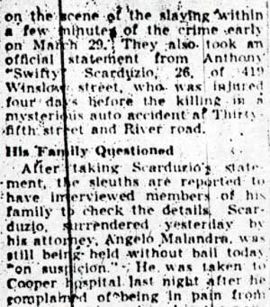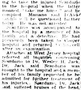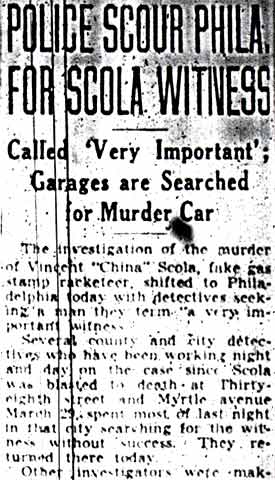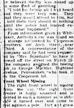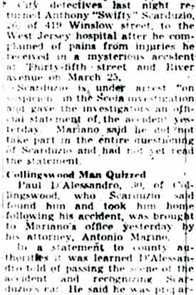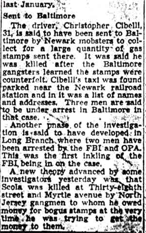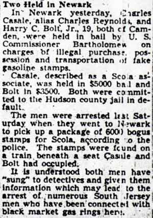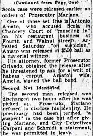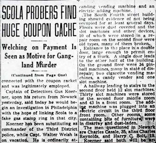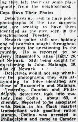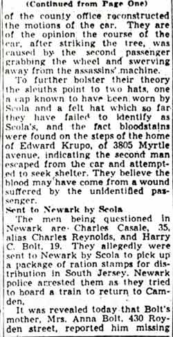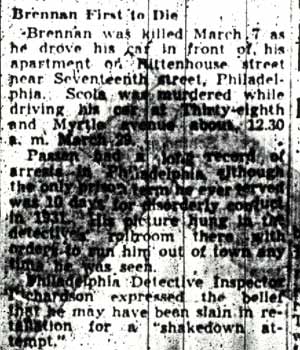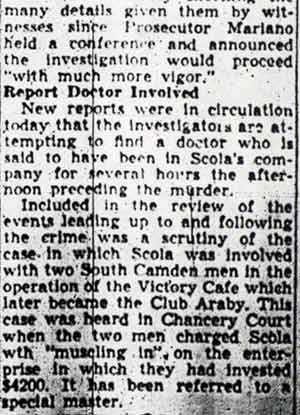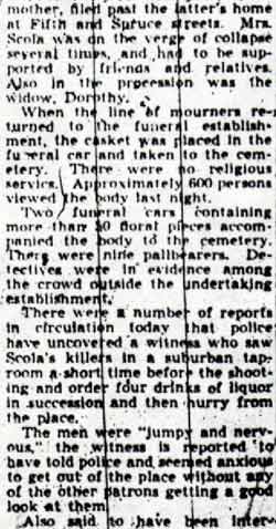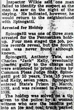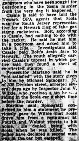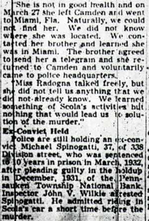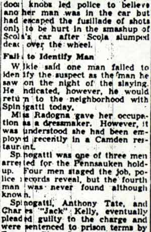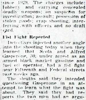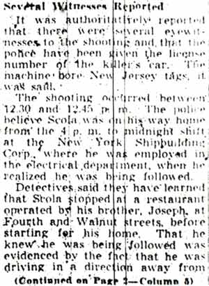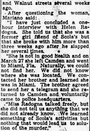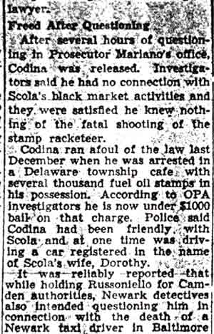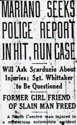 VINCENT SCOLA was born in 1911, the oldest son of Domenico and Maria C. Scola. At the time of the 1920 Census the Scolas were living at 347 Spruce Street, Domenico Scola then working as a construction laborer. By April of 1930 the Scola family lived at 839 South 4th Street, the corner of South 4th and Spruce Streets, where Domenico Scola owned and operated a candy store. Beside Vincent the family at that time included Tony, 14 Joseph, 13, Angeline, 12, and Edith, 10 years of age. Two doors down, at 835 South 4th Street lived the Tenerelli family. The Tenerelli boys, Michael and Frank, boxed professionally as mickey blair and Frankie Blair. Mickey Blair's life outside the ring would follow a pattern similar to that of Vincent Scola. Vincent Scola, also known as "Cheeno" and "China", was first arrested in 1929. By April of 1944 he had been arrested on nine separate occasions in Camden, on charges that included robbery, carrying concealed deadly weapons, suspicion for investigation, assault, possession of stolen goods, crap shooting, interfering with police officers, failure to carry a draft card, and possession of automobile tires, an offense during the World War II years. Apparently he evaded successful prosecutions in all of these cases. Crime was paying off for Vincent Scola, and he had moved out of Camden, to a home at 5301 Sherwood Terrace in Pennsauken NJ with his wife Dorothy. He also owned and operated a restaurant at 1114 South 4th Street. Vincent Scola was suspected of being involved with the wartime counterfeit gasoline rationing stamp racket when he was gunned down while driving his Cadillac at 38th and Myrtle Streets in East Camden. Struck by a shotgun blast to the neck and head, his car went out of control, overturned and burst into flames. The Scola case was front page news in Camden for two weeks. Various theories as to why he was murdered were put forth, including that he had been attempting to muscle in to gambling in Camden and Burlington counties, and he was killed in retaliation for the murder of Philadelphia gangster John P. Brennan, who had attempted a similar power grab in Camden several weeks earlier. It is worth noting that another former South Camden boxer,Rocco "Roxie Allen" Auletto, was working for Brennan as a bodyguard when he was gunned down. Vincent Scola was buried at New Camden Cemetery on Haddon Avenue in Camden. He was survived by his wife, who joined him in 1966, his parents, and siblings. Several suspects were questioned, and the cycle of gang-related violence did not end with Vincent Scola's murder. |