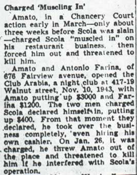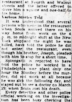 OF SCOLA IN BUSINESS JAILED BY MURDER PROBERS Restaurant Owner Charging 'Muscling in' Seized; Man Sought in Phila. |