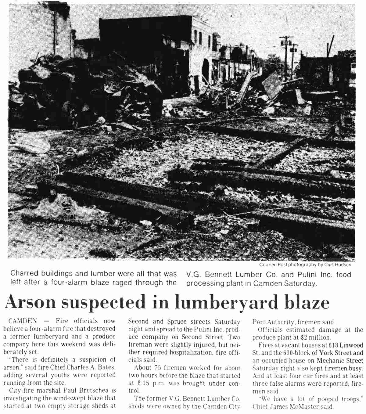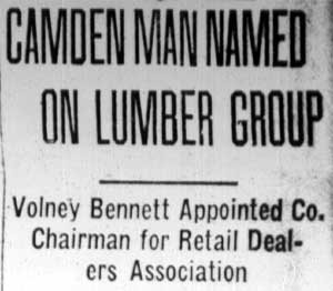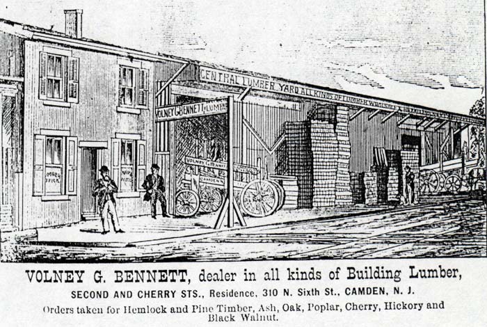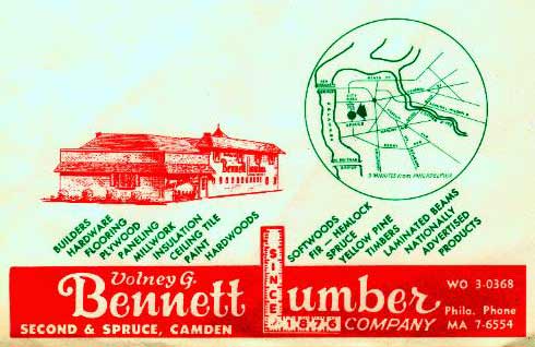 The Volney Bennett Lumber Company , founded in 1876, played a great role in the construction, commercial, and industrial development of Camden until 1979, when, after 103 years in Camden, the firm was forced to move to to redevelopment and eminent domain. It now operates, along with Mr. Roberts Lumber Centers, at 50 Clements Bridge Road, Barrington NJ.. |