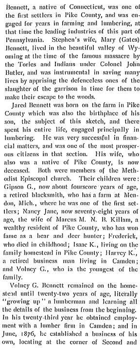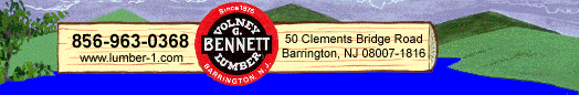 Until 1912 we delivered by horse and wagon. When a customer, a local truck manufacturer, was unable to pay his bill we took a truck in exchange for our lumber. The Bennett firm can trace its roots to the year 1876, but the part that Camden, New Jersey played in regional lumber history extends even further back. The rafting of felled timber, from northeast Pennsylvania and adjoining New York, down the Delaware River began in 1764 and quickly proved to be the best method to move these logs to Philadelphia for processing. Soon the bustling port area of Philadelphia became clogged with rafts that proved a hazard to shipping. The local timber merchants cast a wistful eye at the mud flats and shallow shore line of New Jersey and began storing the large timber rafts on the eastern shore of the Delaware. Log pens were constructed by driving pilings into the riverbed. This prevented the timber from being carried off by the changing tides. In a normal progression, saw mills began to appear on the Jersey shore of the river to process the stored timber. The first recorded mill built was by William Carmen in 1822 and was steam operated. Three lumber merchants were already conducting business in Camden when Carmen constructed his mill. Shingle manufacturing was another industry in this fledgling South Jersey town. Two shingle producers generated enough waste by-products that their refuse pile became known as Shingle-Shaving Hill and was a favorite of local children for winter sledding. Initially, the vast amount of sawdust produced by the numerous Camden saw mills created logistical problems. But uses were quickly found: much of the sawdust was dumped to fill lowlands, in some places as much as forty feet deep, while a substantial amount served as fuel in the mills and other businesses. By the 1840's, the lumbering industry accounted for a substantial amount of the expanding City’s waterfront from Cooper’s Point to Market Street, either for raft storage or with sawmills. Lumberyards also consumed a significant amount of land in the downtown area as the timber industry created homes, jobs and fortunes. The development of Camden neighborhoods indicated the local need for lumber, but lumber demand by wholesale dealers, housing and industrial use was even stronger across the river in Philadelphia. Camden sawmills produced almost every wooden housing component: joists, beams, floorboards, laths, doors, windows, sash, moldings, decorative work and roofing singles. Lumber processing became the largest industry in Camden in the 1850's as rafting traffic down the Delaware increased. In addition, rafts of timber, mostly white pine from central and northern Pennsylvania began moving down the Susquehanna River to Port Deposit, Maryland at the head of the Chesapeake Bay. Camden lumber merchants made purchases of this timber at either Port Deposit, Maryland or Marietta, Pennsylvania. The rafts then were moved through the Chesapeake and Delaware Canal to the Delaware River and towed to Camden. In 1859, Volney G. Bennett, a 23 year old lumberman from the logging and rafting community of Hawley, Pike County, Pennsylvania arrived in Camden, reportedly on one of the Delaware River log rafts. His brother, Harvey, had been living in Camden since 1850 and worked in a local sawmill. Volney began as a laborer at the McKeen & Bingham Lumber Company , which operated a steam sawmill and gristmill as well as a lumber yard on Water Street above Cooper. Both McKeen and Bingham were also from Pike County. Bennett advanced quickly at the firm and by 1865 had become a clerk. He remained at this location until 1876. William and Franklin Holbert, also from Pike County, influenced Volney to relocate to their establishment in central Camden, Their Holbert & Branning Lumber Company , established in 1872, conducted a steam sawmill, wharf and a sales operation known as the Central Lumberyard . The management of this company decided to concentrate their efforts on the processing and wholesale end of the lumber business. So after brief negotiations. Volney G. Bennett leased the Central Lumberyard in 1876. Located at this site was Bennett’s first sales office. By the end of 1876, Bennett had purchased his first piece of property for lumberyard use, where he erected his second sales office, storage sheds and stables. Bennett assumed the Central Lumberyard name and continued to use it even after he moved his yard one block north of its original location. This move allowed Holbert and Branning to expand their drying yards. Volney Bennett still provided a local outlet for the sawn lumber and other wood products from the adjacent sawmill. The Central Lumberyard had a banner year in 1887, when Volney Bennett purchased additional lots, expanding his business to fill an entire city block. An 1890 account of the yard described it as follows: This enterprise had its inception in 1876. The premises occupied are 222 by 360 feet in Dimensions, extending from Front to (south) Second Streets and from Cherry to Spruce Streets. About one-half of the yard is covered with shedding for the storage of finer grades. An enormous stock is carried at all times of all kinds of Building Lumber, such as White and Yellow Pine, Hemlock, Spruce, etc. Mr. Bennett enjoys the closest relations with the dealers and manufacturers in the West and South and is thus enabled to handle stuff at the lowest figures… The business gives employment to about ten men and four teams are required for local delivery. The Holbert & Branning sawmill was dismantled in 1893 and the drying yard land sold for other uses. Rafting on the Delaware River was discontinued in 1900 as the Upper Delaware timber regions had been clear cut. In a prudent business move, sawmills were relocated closer to the timber source, so that Bennett received an increasing amount of its lumber, by ship and railroad car, already cut, dried and dressed. Most of the sawmills disappeared from the Camden riverbank by thi