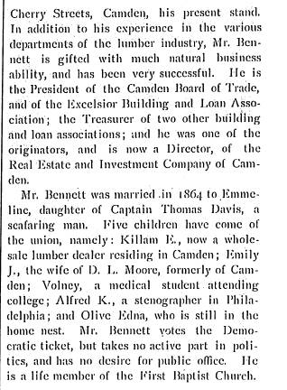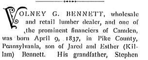 BENNETT, LUMBER, THE situation of Camden, with its great receiving and shipping facilities, makes it a most desirable point for the location of large lumber yards. Among the best known in the Southern section of the city may be mentioned that of Mr. Volney G. Bennett, a gentleman of vast experience in this line, having been in this line of trade all his business life.