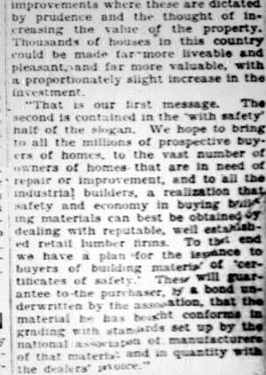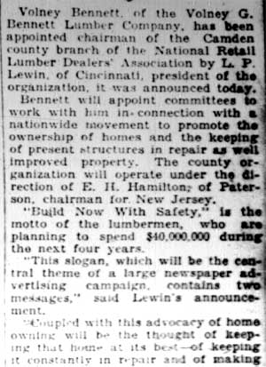 Civic responsibilities and other careers were pursued by Bennett and his children. Volney G. was an officer in several Camden Building & Loan Associations and was the first President of the Camden Board of Trade. He also constructed many blocks of homes, both in Camden and its suburbs. Killam Bennett was a wholesaler of Yellow Pine. In addition, he owned a local newspaper, The Post-Telegram, published in Camden, For several years he was the mayor of Riverton, New Jersey, where he resided. Volney, Junior stayed with the lumber firm and had a long and distinguished career as president of the Camden Board of Trade, following the death of his father. He also served as mayor of Merchantville, New Jersey, his place of residence. Alfred K., after serving as a Company incorporator, moved to Pasadena, California and constructed a large hotel. He was also instrumental in the founding of the Rose Bowl Parade. In the 1910's the Volney G. Bennett Lumber Company corporate slogan was simply, "Buy Bennett’s Lumber". By the 1920's, it had become "As ‘Sterling’ is to Silver, so ‘Bennett’ is to Lumber". By 1924, Bennett Lumber was advertising the sale of lumber, sheet-rock and Creo-Dipt shingles. Other period advertisements asked consumers "Are you planning to remodel your home?" and requested potential clients to come to Volney G. Bennett Lumber Company for suggestions. These ads indicated the company’s trade in a variety of building materials, besides lumber, and the firm’s appeal to the home-improvement market as early as the 1920's. Business for the company continued briskly, despite the vagaries of the Great Depression. However, in 1936 the Bennett family lost control of the corporation to Arthur Collins, who started working for the company in 1912 as a bookkeeper. During World War II, Bennett Lumber supplied much of the lumber required for the regional war effort. After the war ended, many of the firm’s customers continued to be local carpenters and contractors who followed the tradition, begun in 1876, of traveling to the city’s waterfront for their building material needs. The housing boom in the Camden suburbs was good for the local lumber wholesale and retail trade that now mainly sold processed lumber shipped in from various parts of the country. In the post-war era, many of the old Camden lumber firms along the waterfront either closed or moved to the suburbs.