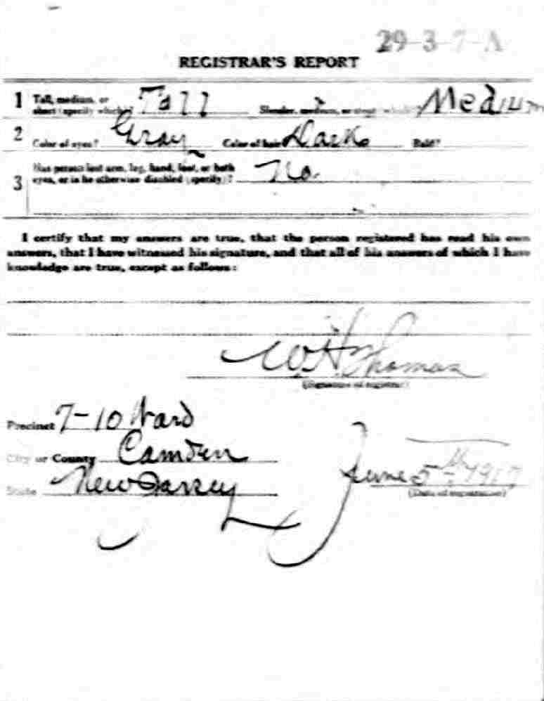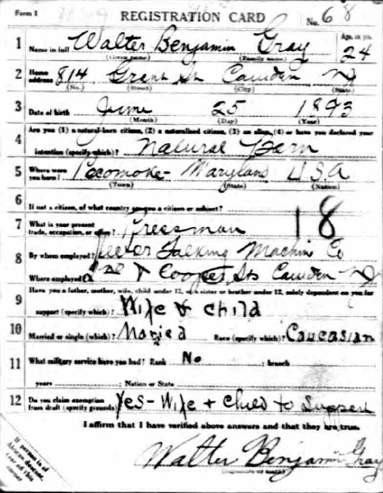 WALTER BENJAMIN GRAY was born June 25, 1893 in Worcester County, Maryland to Stephen Edward Gray and his wife, the former Sallie Virginia Mason. There were three younger brothers, Edward Lee Gray, Maurice William Gray, and Clarence Wesley Gray. He grew up in Worcester County, residing there through 1910. The 1900 Census shows the family, the consisting of Mr. & Mrs. Gray and sons Walter and Edward, living in Pocomoke, Maryland, Stephen Gray was then working in a shipyard. The 1910 Census shows the family in Colston, Maryland. Walter B. Gray married Clemence Ruth Lindley, of 534 Cedar Street in North Camden, around 1914. The 1915 and 1916 Camden City Directories shows Walter and Clemence Gray living with her parents at 534 Cedar Street. He was then working as a machinist. Son Edward Gray was born in 1916. The 1917 City Directory shows Walter Gray working as a clerk and living at 842 Grant Street. When Walter B. Gray registered for the draft on June 5, 1917 he was living with his wife and son Edward at 814 Grant Street in North Camden. Walter B. Gray was then working as a pressman for the Victor Talking Machine Company. The 1918 City Directory shows that the Walter Gray family was still at 842 Grant Street. Walter Gray was then working as a railroad brakeman. His brother Edward had come to Camden, was living at the Grant Street address and was also working as working as a brakeman. By January of 1920 Walter Gray's brother Morris had also come to Camden and was living at the Grant Street address. Walter Gray had returned to work at the Victor Machine Company, while his brothers worked for the railroad, Edward as a brakeman, Morris as a switchman. By the time the 1921 City Directory was compiled, Walter and Clemence Gray had moved to 547 York Street. He had also been appointed to the Camden Fire Department shortly after the 1920 Census enumeration. Walter Gray is listed as being with the department in the 1921, 1922, and 1923 City Directories. Sadly, Walter B. Gray died on January 21, 1924. He was survived by his wife Clemence, son Edward, his brothers, and his parents. A few years later Clemence Gray married again. Her new husband was Rollo Jones, who was promoted to Battalion Chief in April of 1928. Rollo Jones passed away in Camden in 1940. It is unknown as of this writing what became of his wife. |