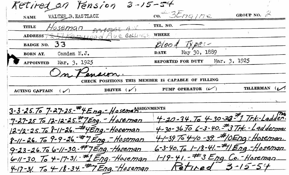 AND FIREMEN WILL ELECT TODAY The Camden Police and Firemen's Association will hold election of officers today at its headquarters, 1175 Whitman Avenue, from 1:00 PM to 9:00 PM. Herbert Bott is unopposed for re-election as president. William Thorn is unopposed to replace Richard Middleton for financial secretary and Walter Vecander is unopposed for the new post of assistant financial secretary. All these are police officers. The police trustees will be named from the following nine candidates: William Marter, George Ward, William Britner, Joseph Shreeve, William Schriber, Joseph Mardino, Joseph Dunnett, Leon Feltz and Russell Young. Two police sergeant-at-arms will be chosen from among Stanley Wirtz, Harry Cattell, Joseph Schultz and George Clayton. Three candidates are seeking the post of vice president, which goes to a fireman. They are William Spencer, Charles Edwards and albert dukes. Warren Rich , a fireman, is slated to succeed himself as recording secretary and Winfield Leviseur is unopposed for the new post of assistant recording secretary, which goes to a fireman. Four fireman trustees will be chosen from ten candidates. They are charles cook, Henry Baumgartel, walter eastlack, Arthur Batten, William Getner, William Toy, lawrence newton, James Young, Russell Anderson and William Taylor. Three firemen are seeking two posts as sergeants-at-arms. They are William Judge, John Mulligan and Furman Price. |