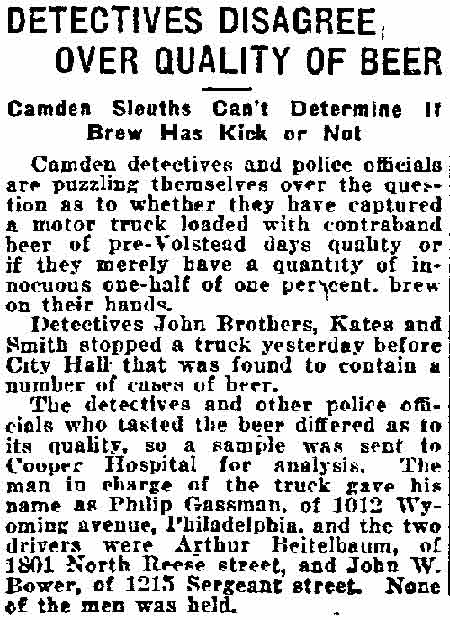 It's' Agin the Law' To Sell Rum Here Without a License Somebody opened a "store" at 15 south fourth street y esterday, without the formality of first obtaining a “soft drink license’. Lieutenant Herbert Anderson and District Detectives Walter Smith and John Trout were the first customers. They entered the place after reading that chicken dinners could be purchased for 20 cents. But, according to police, "they didn't find an egg" in the place. But what they did find was an improvised bar, a quantity of whisky and several cases of home brew. They dumped the liquor, they said, and told the proprietor to "close up until he got a license." They didn't bother with the name . |