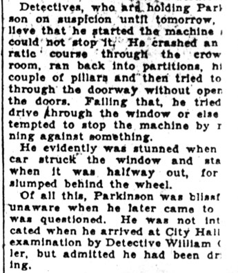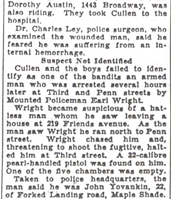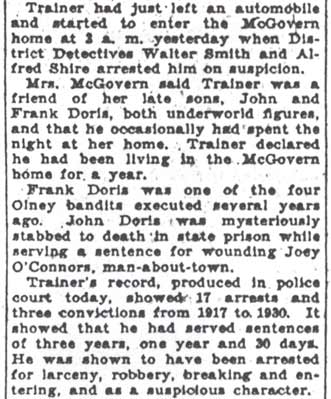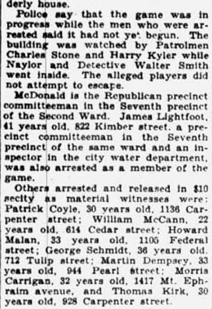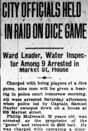 NABBED AGAIN IN RAID James "Jimmy" Rodgers, 28, former boxer; fell into the hands of police again last night when they raided a speakeasy at 1000 Segal Street, allegedly operated by him. One gallon of whisky and 65 pint bottles were confiscated by the raiders, who were led by District Detectives Walter Smith, Marshall Thompson and Harry Kyler. Three others were arrested. One of them, James Greer, 35, of 332 North Second street, placed a charge of possession of stolen goods against Rodgers when police unearthed some articles stolen from Greer two months ago. Others arrested were Thomas Spencer, 33, of the Segal Street address, and John D. Wood, 35, of 928 Kimber Street. Rodgers has fallen afoul of the law on numerous occasions. He has been arrested several times for operating speakeasies. He was also arrested as a material witness in the "shooey" Bonner murder two years ago. He will be given a police court hearing today, Detectives raided a vacant dwelling at 225 Chestnut Street last night and seized a "moonshine" plant consisting of two stills, 36 barrels of mash and oil and gas stove cookers. The place had been under observation by Detective Vernon Jones for two weeks. No one was inside when Jones and Patrolmen George Hemphill and John Houston entered. A 50 gallon still was on the second floor and a 35 gallon still on the first floor. |