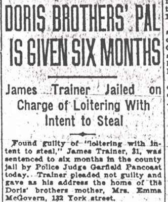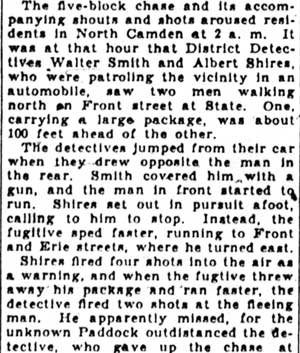 RODGERS IS GIVEN 180 DAYS James "Jimmy" Rodgers, 28-year-old former boxer who on numerous occasions has run afoul of the law, was sentenced yesterday to serve 180 days in the county jail for operating a speakeasy at 1000 Segal Street. In addition, he was held without bail by Police Judge Pancoast on a charge of possession of stolen goods. The goods were identified by their owner, James Greer, 35, of 332 North Second Street, who was in the speakeasy when police raided it Monday night. Greer turned state's evidence against Rodgers in police court yesterday, and for a reward, received a suspended sentence. District Detective harry kyler, Marshall Thompson and Walter Smith raided the speakeasy and confiscated 65 pints of whisky in bottles and a gallon of whisky in a jug. Kyler testified Rodgers was not there when the raiders entered the place but appeared later and was arrested. 3 Others Nabbed Three others were arrested in the place. These were Greer, Thomas Spencer, 33, who gave the speakeasy as his home address, and John D. Wood, 35, of 928 Kimber street. Spencer has been arrested approximately 75 times, the police said. The detectives, when searching the premises, found a suitcase filled with shoestrings, collar buttons and other merchandise. Greer identified the case and its contents as having been stolen from his car when it was parked on Segal Street near Front some time ago. He lodged the complaint of possession of stolen goods against Rodgers. Rodgers was arraigned on three charges, including the stolen goods count. The other complaints were that he sold beer without a license and violated Section 422 of the city ordinances which prohibits disorderly persons to congregate on the premises. Rodgers pleaded not guilty on all three charges, and told the court he had "nothing to say." He was fined $200 on each of the charges of violating Section 422, and selling without a license, and when he did not pay, he was sentenced to 90 days on each of the two counts. He was committed to the county jail without bail on Greer's complaint of possession of stolen goods. Greer testified that he had purchased liquor in Rodgers' place several times, as late as last night. Greer's sentence was suspended. Spencer Refuses to Talk Spencer refused to testify against Rodgers. He said he did not know l "what was going on there" and that he was there painting. "You won't be painting there for 90 days," retorted the court in pronouncing sentence. Wood, the other man arrested in the place, did not appear in court and forfeited $10 security he had posted after the raid. Rodgers has been arrested several times for operating speakeasies. He was also arrested as a material witness two years ago in the murder of William "Shooey" Bonner." Spencer was arrested so often when he resided in Gloucester that he became known as "Gloucester's Peck's Bad Boy," the police said. Since moving to Camden he has been arrested arrested nearly 50 times, police stated. The majority of his arrests have been on charges of drunkenness and disorderly conduct, but in 1925 and in 1926, he was arrested on a charge of larceny of automobile. Again in 1929 he was charged with non support, when he was ordered to pay his wife $10 weekly. Back In 1916 he was arrested on a charge of stealing a gold watch. |