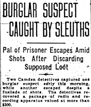 Wanted: Targets for Camden’s new desperado eliminators. Bandits, burglars, snipers and their ilk are requested by Chief of Police James E. Tatem to apply at police headquar-ters Monday morning at 10 o’clock, when a practice shooting party will be held. Chief Tatem said today Camden’s bandit-chasing squad is “just rarin’ to go” with six new automatic rifles guaranteed to shoot full of holes the toughest bandit in less time than it takes to say “Aligoop.” For the further enlightenment of the bandit fraternity, Chief Tatem announced detailed instructions on how to0 use the new carbines will be given this afternoon at 3 o’clock to bandit chasing police by Captain Arthur Colsey and Herman Engle, a representative of Stein Brothers, this city. The rifles arrived at police headquarters yesterday afternoon. They will be distributed in each of the city’s three police districts in the campaign to rid the city of desperadoes. The weapons can fire a magazine of 20 shots in a few seconds. They will be mounted in the three red bandit chasing coupes used by the district squad members. One of the coupes is now being used by Archie Reiss and Vernon Jones in South Camden, while two others are expected to be delivered within a few days, according to Chief of Police James E. Tatem. They will be assigned to walter smith and Joseph Carpani, First district detectives and Louis Schlam and Richard Donnelly in the East Camden district. Swivel attachments make it possible to fire the guns from a fixed point in an automobile. Detached they may be fired from the shoulder. Besides firing a magazine of 20 shots without stopping, they can be adjusted to single fire, using .45 caliber cartridges. Instruction in the adjustment and use of the weapons will be given today by a representative of the company that sold them- at $175 each— to the city . |