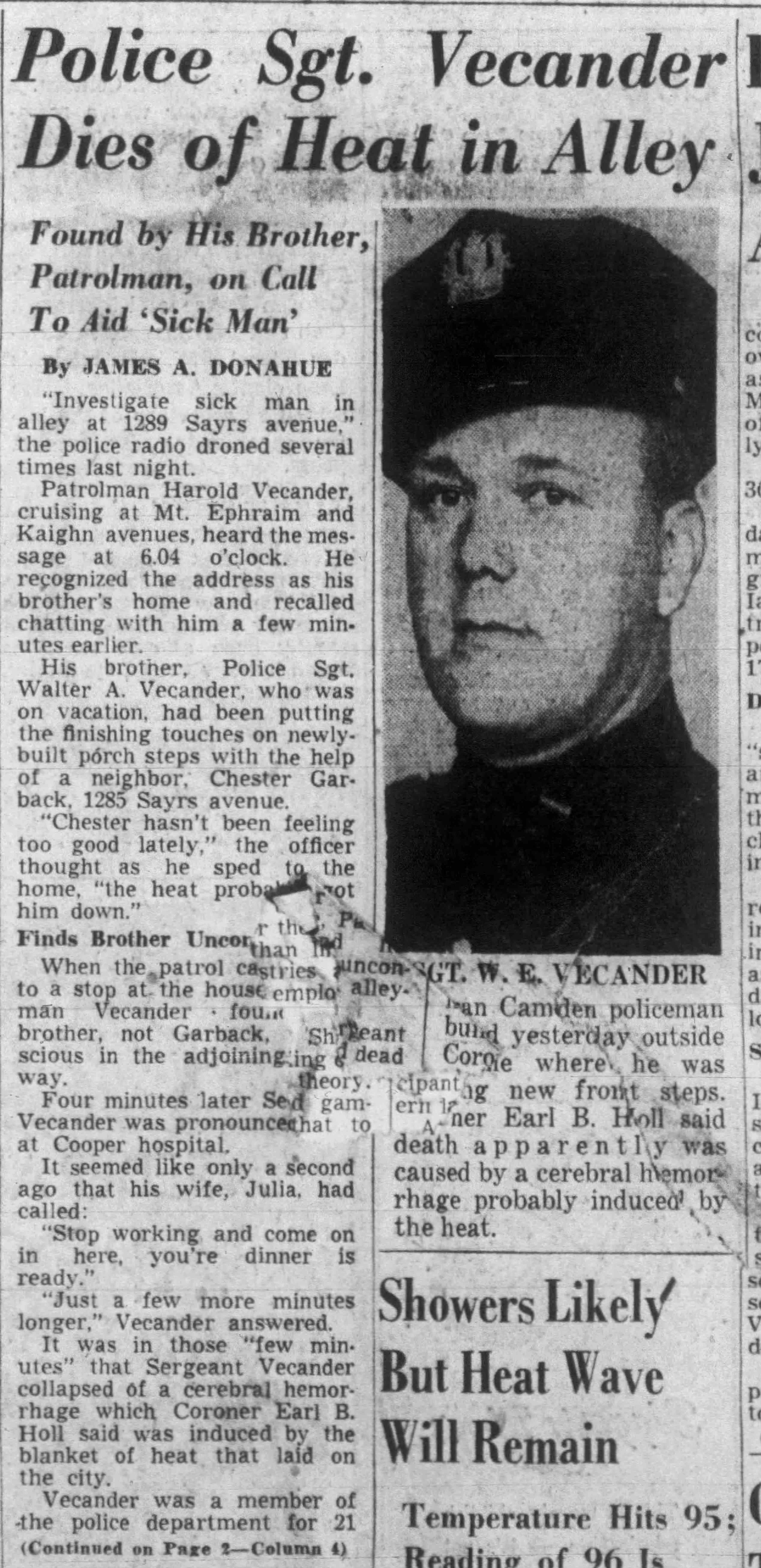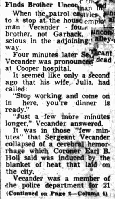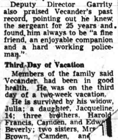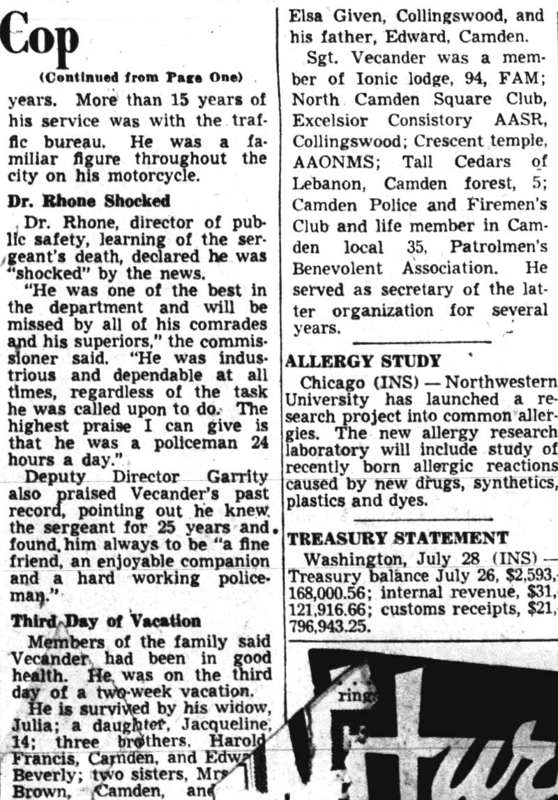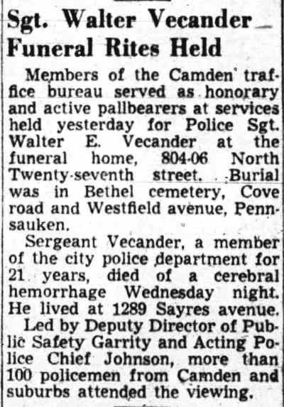 AND FIREMEN WILL ELECT TODAY The Camden Police and Firemen's Association will hold election of officers today at its headquarters, 1175 Whitman Avenue, from 1:00 PM to 9:00 PM. Herbert Bott is unopposed for re-election as president. William Thorn is unopposed to replace Richard Middleton for financial secretary and Walter Vecander is unopposed for the new post of assistant financial secretary. All these are police officers. The police trustees will be named from the following nine candidates: William Marter, George Ward, William Britner, Joseph Shreeve, William Schriber, Joseph Mardino, Joseph Dunnett, Leon Feltz and Russell Young. Two police sergeant-at-arms will be chosen from among Stanley Wirtz, Harry Cattell, Joseph Schultz and George Clayton . Three candidates are seeking the post of vice president, which goes to a fireman. They are William Spencer, Charles Edwards and albert dukes. Warren Rich, a fireman, is slated to succeed himself as recording secretary and Winfield Leviseur is unopposed for the new post of assistant recording secretary, which goes to a fireman. Four fireman trustees will be chosen from ten candidates. They are charles cook, Henry Baumgartel, walter eastlack, Arthur Batten, William Getner, William Toy, lawrence newton, James Young, Russell Anderson and William Taylor. Three firemen are seeking two posts as sergeants-at-arms. They are William Judge, John Mulligan and Furman Price. |