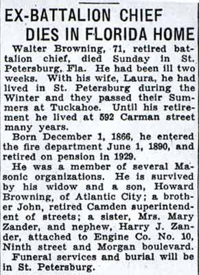 WALTER W. BROWNING was born on December 1, 1866 to Jacob and Rebecca Browning. His early years were spent in Camden, where his father was a ferry boat pilot. The 1880 Census shows the family living at 403 Bridge Avenue, a few doors away from Camden Fire Department member Benjamin L. Kellum. By 1882 the family was living at 571 Carman Street. They were still at that address into the mid 1890s. Walter W. Browning worked as a painter in these years, until appointed to the Fire Department in 1890. Walter W. Browning joined the Camden Fire Department on June 1, 1890 as a charter member of Engine Company 4. Engine Company 4 was organized on June 1, 1890 at 320 Vine Street in North Camden, with a two-hitch, second class Button steam engine and a one-hitch Button hose carriage. The charter members were as follows; Company Foreman, Amadee Middleton; engineer, Francis Turner; stoker C. Barney Harvey; driver, edward hartman; and hosemen Walter W. Browning and Charles Berry. Walter Browning lived at 571 Carman Street with his parents into 1893. City Directories shows him living at 593 Bridge Avenue in 1894 and 1895, at 18 Haddon Avenue in 1896, at 215 Broadway in 1897 and at 334 Vine Street in 1898. The 1899 City Directory shows that Walter W. Browing had returned to Carman Street. His address in that year;s Directory was 588 Carman Street. By the time the Census was taken in 1900 he had moved to 592 Carman Street. Walter W. Browning lived his wife Laura and son Howard at 592 Carman Street from 1900 until his retirement from the Fire Department on a pension in 1929. When he retired, Walter Browning had risen to the rank of battalion chief within the Fire Department. After he retired, Walter Browning moved to Tuckahoe NJ. He and his wife would spend the winters in St. Petersburg FL. Walter Browning passed away on January 16, 1938. He was survived by his son, sister Mrs. Mary Zander, nephew Harry Zander, also a Camden fireman. He was also survived by his brother, John Browning, who had retired as the Superintendent of Streets for the city of Camden. |