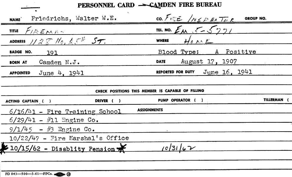 Friedrichs was appointed to the Camden Fire Department on June 1,