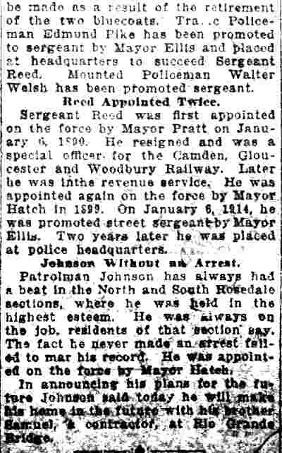 WALTER T. WELCH was born in Camden NJ on November 19, 1884 to William E. and Mary Welch. He was named for his paternal uncle. William E. Welch worked as a stationary engineer, tending to a drawbridge in the 1880s and 1890s, and later to the boilers at an asylum when the 1900 Census was enumerated. Another uncle, Samuel M. Welch, was a blacksmith in what was the Town of Stockton (present-day Cramer Hill and East Camden) and served as Chief Engineer, supervising and coordinating the work of Stockton's volunteer fire companies from 1893 through 1896. At the time of the 1910 Census Walter T. Welch was living with his parents at 434 Washington Street in Camden, and working as a house painter. Also at home were younger siblings Estella and Thomas Welch. Walter T. Welch married Elsie Dischert, whose mother kept a boarding house at 428 Stevens Street, around 1913. 434 Washington Street is at the corner of Washington and West Street. The adjacent house on West Street was that of Detective William Schregler of the Camden Police Department. Schregler appears to have taken an interest in Walter Welch, and Welch would join the police force during the ensuing decade. At the time of the 1920 Census Walter Welch lived with his wife Elsie at 518 Benson Street . At the time of the census there were two daughters, Eleanor and Doris. A son William, was born early in 1920. Walter Welch had been promoted to sergeant by February of 1928. By 1930 mother-in-law Mary Dischert was living with the family as well. During his early years with the Camden Police Department, Walter Welch served as a member of the mounted police unit. Walter T. Welch reached the rank of Captain before retiring in 1943. He and wife Elsie were both still living at 518 Benson Street as late as the fall of 1959. The Welch family also had a summer home at the Jersey shore in Ship Bottom NJ. Walter T. Welch spent his last years in Vineland NJ. He died in January of 1968. |