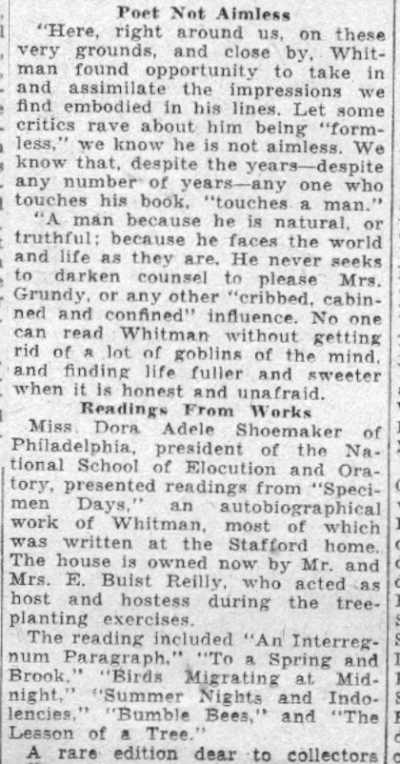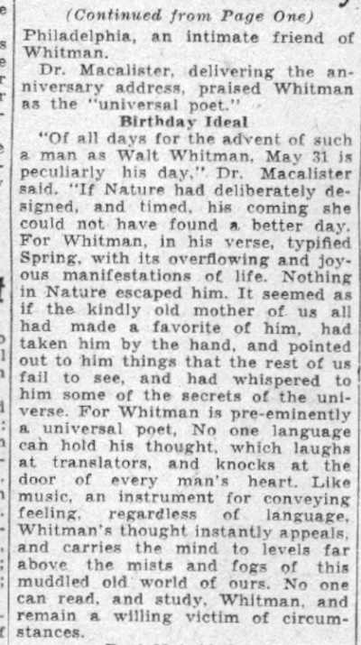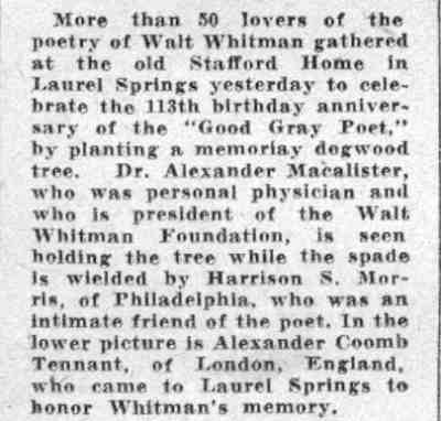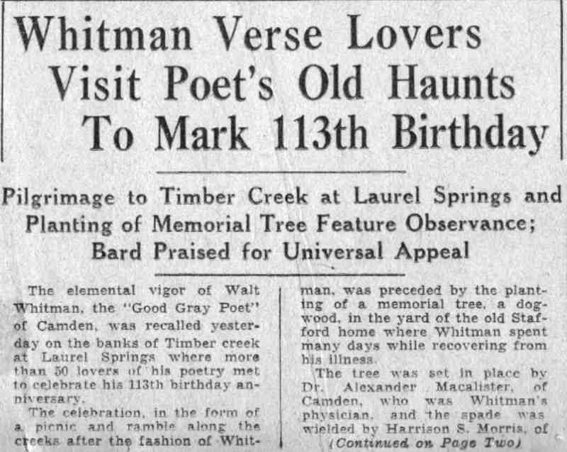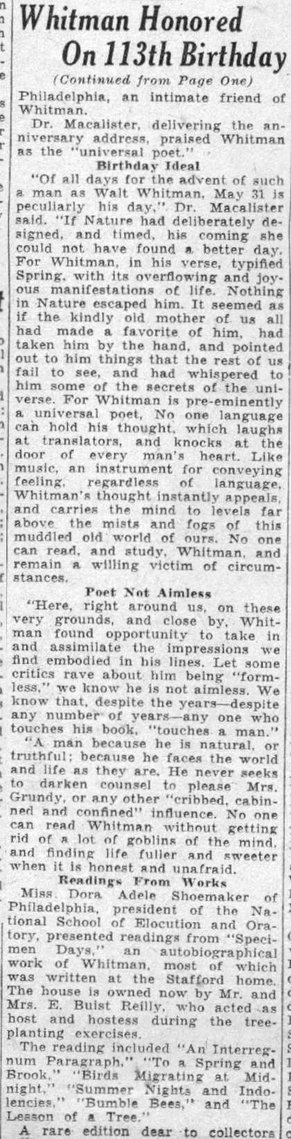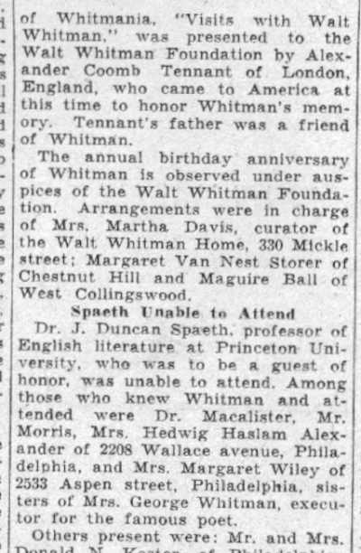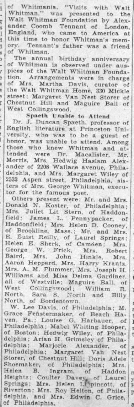 Acclaimed as 'International Prophet' Wescott Recalls Friendship with Poet at Ceremonies Here Marking 120th Anniversary of his birth; Donaldson Tells of Buggy Gift. by Walter B. Batezel Acknowledged by the world as the poet of democracy, Camden's own Walt Whitman was acclaimed here yesterday on the 120th anniversary of his birth as the "prophet of a new internationalism." This interpretation of Whitman and his famous "Leaves of Grass," which introduced free verse to the world and the rugged liberty loving character of America so lustily praised in his songs, was offered by Ralph W. Wescott, of Haddonfield. Wescott was one of three speakers for the Walt Whitman Foundation which is charged with maintenance of the Whitman home at 330 Mickle Street as a literary shrine. Also speaking on Whitman were Thomas B. Donaldson, Philadelphia insurance man, who as a boy knew Whitman, and Mrs. Elizabeth Cady Conover, also of Philadelphia. The meeting was held at the headquarters of the Camden County Historical Society, Euclid Avenue and Park Boulevard. Wescott, former comptroller of customs of the Port of Philadelphia and son of the late Judge John W. Wescott, who was an intimate friend of Whitman in Camden and who twice nominated Woodrow Wilson for the presidency, based his lauding of Whitman as an "international prophet" upon excerpts from Whitman's books. Urged Universal Freedom "It is the very catholicity of the man which causes us to celebrate his birthday anniversary," said wescott. "He has been seen as the precursor of socialism and the completely going anti-socialist." "We almost shrink from news abroad, and we are bound to consider what Whitman's response would have been. In his poem 'Salutation', I think we find in Whitman the prophecy of a new internationalism, a poem in which he asked for universal freedom against slavery, and called for an international brotherhood." "It is unique and significant that on this 120th anniversary of Whitman the New York World's Fair acclaims him by statue and adulation, and in 1876 during the Centennial Exposition in Philadelphia Whitman indited a poem addressed to foreign readers in which he directed their attention to 'the peculiar glory of the United States' as something 'vaster, saner, more splendid in comradeship, knitting closer all nations and humanity.'" "Whitman himself wrote poets were necessary to fulfillment of a world brotherhood because their work was needed to vitalize the message of statesmen. Preached Good Will "In the British-written preface to Whitman's 'Specimen Days in America,' which he wrote in Camden and Laurel Springs, there occurred the sentence 'Whitman preached goodwill between common people of all nations. In all the things written of him, Whitman said he liked that description best. " "So, in Whitman's own words we find the real message, and as expressed in one of his poems, and so which was an obsession with him in his declining days—we instinctively seek a 'universal, comprehensive solidarity of man.' There was no braver or more humanistic American writer than Whitman, nor more humanistic statement for the world than his 'Leaves of Grass.' "Boyhood Recollections of Whitman," by Donaldson, whose father Blaine Donaldson, of Philadelphia, was a benefactor and fast friend of Whitman, regaled the little literary group of 40 which appeared to honor the birthday of the "Good Gray Poet." It was Donaldson's father who, anxious to aid the paralytic poet in reaching the outdoors, wrote to all of America's most famous writers and asked they subscribe to a fund to purchase a pony and buggy for Whitman. Great Writers Gave The contributors to the fund, Donaldson said, included Ralph Waldo Emerson, John Greenleaf Whittier, John Burroughs, Robert W. Ingersoll, Rutherford B. Hayes, General Phil Sheridan and Oliver Wendell Holmes. "Hayes and Sheridan were frequent visitors to our home," said Donaldson, "as was Henry Irving, the actor. Sheridan came often to sniff brandy and Whitman met these men there, but Walt came chiefly for mental regalement and food, because my mother was a good cook." "I was a lad of eight to eleven years when Whitman made his visits, and no matter who was there Whitman always dominated the room. In fact, he loved my father so much that he requested that my father be a pallbearer for him." "My sister and I sat in his lap often, and we liked that because he looked like Santa Claus, and most children were drawn naturally toward him. He was different and comradely. I can pay tribute to Walt's whiskers because he didn't chew tobacco, not then anyway, if later. "Walt had the eyes of a stage manager and nothing escaped and no matter how distinguished the audience, Whitman was the boss. His favorite pastime at our home was dipping bananas into sherry wine and eating them as though they were lollypops. It was in 1885 that my father decided to get Walt a pony and buggy, and when the outfit was purchased as a gift from America's greatest writers to Walt. I was commissioned with a guardian to drive it to Camden. Pony Was Groggy When I got the pony there in the afternoon Whitman came out and said: 'Bless me,' and got in right away. Walt then took to the open in later days, but he soon began to complain the pony was 'groggy and too slow'. A few days later Walt turned up at home with a three-gaited horse. "The horse obviously was too spirited for Whitman's crippled condition, and when this was drawn to his attention he said, 'There is no sense in giving me a crippled horse. What does a helpless hulk like me want with another cripple? This horse is lithesome." "I have some mementos from Whitman which I cherish, but most interesting of all was his personality. To know him was better than any souvenir of him, and in the language of today he had 'umph!' "Mrs. Davis, who took him and who loved him as a mother would, caring for his every wish, was a kind, genial soul, and she in fact, supported Whitman while he saved his money for a monument 
