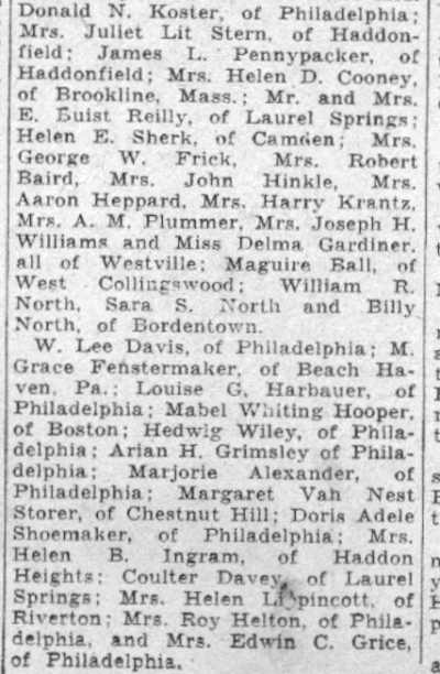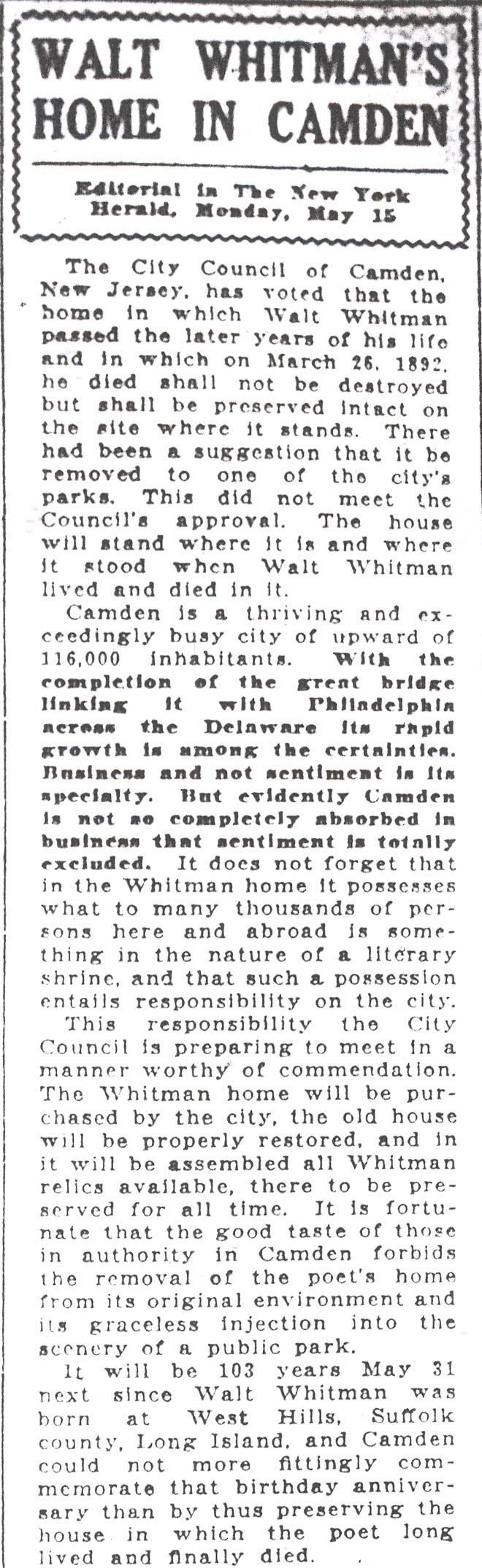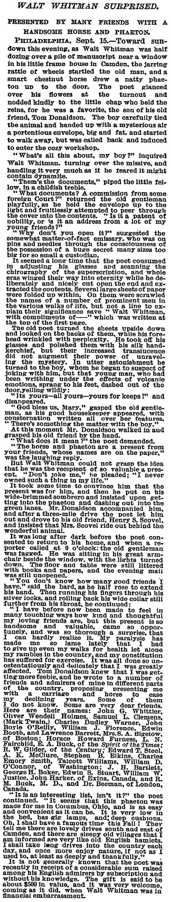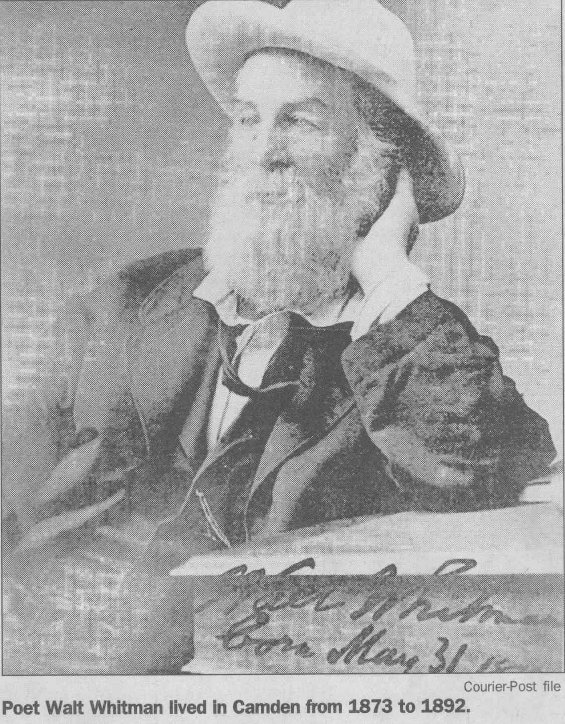 Acclaimed as 'International Prophet' Wescott Recalls Friendship with Poet at Ceremonies Here Marking 120th Anniversary of his birth; Donaldson Tells of Buggy Gift. by Walter B. Batezel Acknowledged by the world as the poet of democracy, Camden's own Walt Whitman was acclaimed here yesterday on the 120th anniversary of his birth as the "prophet of a new internationalism." This interpretation of Whitman and his famous "Leaves of Grass," which introduced free verse to the world and the rugged liberty loving character of America so lustily praised in his songs, was offered by Ralph W. Wescott, of Haddonfield. Wescott was one of three speakers for the Walt Whitman Foundation which is charged with maintenance of the Whitman home at 330 Mickle Street as a literary shrine. Also speaking on Whitman were Thomas B. Donaldson, Philadelphia insurance man, who as a boy knew Whitman, and Mrs. Elizabeth Cady Conover, also of Philadelphia. The meeting was held at the headquarters of the Camden County Historical Society, Euclid Avenue and Park Boulevard. Wescott, former comptroller of customs of the Port of Philadelphia and son of the late Judge John W. Wescott, who was an intimate friend of Whitman in Camden and who twice nominated Woodrow Wilson for the presidency, based his lauding of Whitman as an "international prophet" upon excerpts from Whitman's books. Urged Universal Freedom "It is the very catholicity of the man which causes us to celebrate his birthday anniversary," said wescott. "He has been seen as the precursor of socialism and the completely going anti-socialist." "We almost shrink from news abroad, and we are bound to consider what Whitman's response would have been. In his poem 'Salutation', I think we find in Whitman the prophecy of a new internationalism, a poem in which he asked for universal freedom against slavery, and called for an international brotherhood." "It is unique and significant that on this 120th anniversary of Whitman the New York World's Fair acclaims him by statue and adulation, and in 1876 during the Centennial Exposition in Philadelphia Whitman indited a poem addressed to foreign readers in which he directed their attention to 'the peculiar glory of the United States' as something 'vaster, saner, more splendid in comradeship, knitting closer all nations and humanity.'" "Whitman himself wrote poets were necessary to fulfillment of a world brotherhood because their work was needed to vitalize the message of statesmen. Preached Good Will "In the British-written preface to Whitman's 'Specimen Days in America,' which he wrote in Camden and Laurel Springs, there occurred the sentence 'Whitman preached goodwill between common people of all nations. In all the things written of him, Whitman said he liked that description best. " "So, in Whitman's own words we find the real message, and as expressed in one of his poems, and so which was an obsession with him in his declining days—we instinctively seek a 'universal, comprehensive solidarity of man.' There was no braver or more humanistic American writer than Whitman, nor more humanistic statement for the world than his 'Leaves of Grass.' "Boyhood Recollections of Whitman," by Donaldson, whose father Blaine Donaldson, of Philadelphia, was a benefactor and fast friend of Whitman, regaled the little literary group of 40 which appeared to honor the birthday of the "Good Gray Poet." It was Donaldson's father who, anxious to aid the paralytic poet in reaching the outdoors, wrote to all of America's most famous writers and asked they subscribe to a fund to purchase a pony and buggy for Whitman. Great Writers Gave The contributors to the fund, Donaldson said, included Ralph Waldo Emerson, John Greenleaf Whittier, John Burroughs, Robert W. Ingersoll, Rutherford B. Hayes, General Phil Sheridan and Oliver Wendell Holmes. "Hayes and Sheridan were frequent visitors to our home," said Donaldson, "as was Henry Irving, the actor. Sheridan came often to sniff brandy and Whitman met these men there, but Walt came chiefly for mental regalement and food, because my mother was a good cook." "I was a lad of eight to eleven years when Whitman made his visits, and no matter who was there Whitman always dominated the room. In fact, he loved my father so much that he requested that my father be a pallbearer for him." "My sister and I sat in his lap often, and we liked that because he looked like Santa Claus, and most children were drawn naturally toward him. He was different and comradely. I can pay tribute to Walt's whiskers because he didn't chew tobacco, not then anyway, if later. "Walt had the eyes of a stage manager and nothing escaped and no matter how distinguished the audience, Whitman was the boss. His favorite pastime at our home was dipping bananas into sherry wine and eating them as though they were lollypops. It was in 1885 that my father decided to get Walt a pony and buggy, and when the outfit was purchased as a gift from America's greatest writers to Walt. I was commissioned with a guardian to drive it to Camden. Pony Was Groggy When I got the pony there in the afternoon Whitman came out and said: 'Bless me,' and got in right away. Walt then took to the open in later days, but he soon began to complain the pony was 'groggy and too slow'. A few days later Walt turned up at home with a three-gaited horse. "The horse obviously was too spirited for Whitman's crippled condition, and when this was drawn to his attention he said, 'There is no sense in giving me a crippled horse. What does a helpless hulk like me want with another cripple? This horse is lithesome." "I have some mementos from Whitman which I cherish, but most interesting of all was his personality. To know him was better than any souvenir of him, and in the language of today he had 'umph!' "Mrs. Davis, who took him and who loved him as a mother would, caring for his every wish, was a kind, genial soul, and she in fact, supported Whitman while he saved his money for a monument 