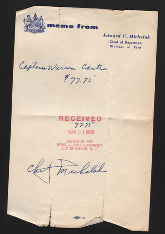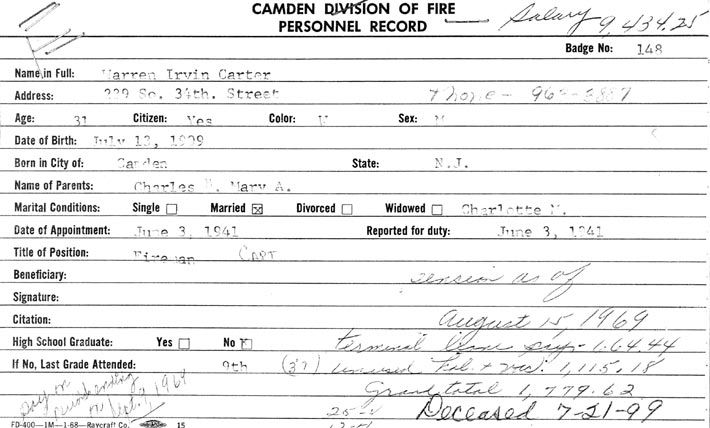 WARREN IRVIN CARTER was born in Camden on July 13, 1909 to Mary A. and Charles B. Carter Sr. Warren Carter was born very late in his parents lives, his father being 49 and mother 42 when he arrived. When the census was taken in the spring of 1910, Warren Carter was the youngest of six children still at home, the others being Edward, Florence, Frances, Charles B. Jr., and Nellie Carter. The family lived at 323 North 37th Street in East Camden. Charles Carter Sr. was working at the Atlas Cereal Manufacturing Company's starch works on Lois Avenue in Cramer Hill. When the census was taken in January of 1920 Charles Carter was working as a mixer at the nearby Kohnstamm starch works. Sister Nellie Carter, then 20, was still living at home. The Carter family was still living at 3052 River Avenue in Cramer Hill into at least the early 1930s. Warren was the only child still at home by April of 1930. Charles Carter worked as a City Park Guard as late as the spring of 1930. Warren Carter and his wife Charlotte had moved to 239 South 34th Street in East Camden by 1940. Warren I. Carter was appointed to the Camden Fire Department on June 3, 1941. Later that year he was a |