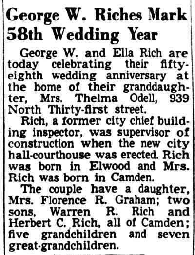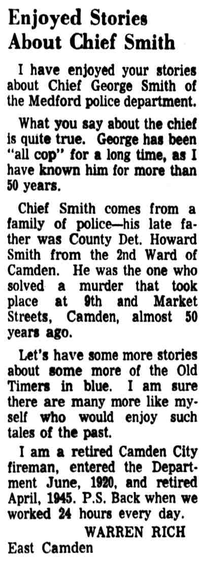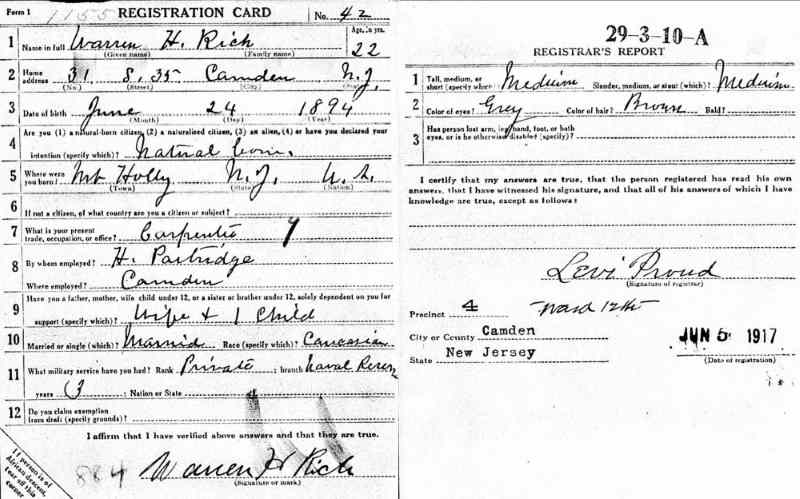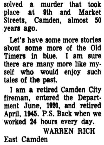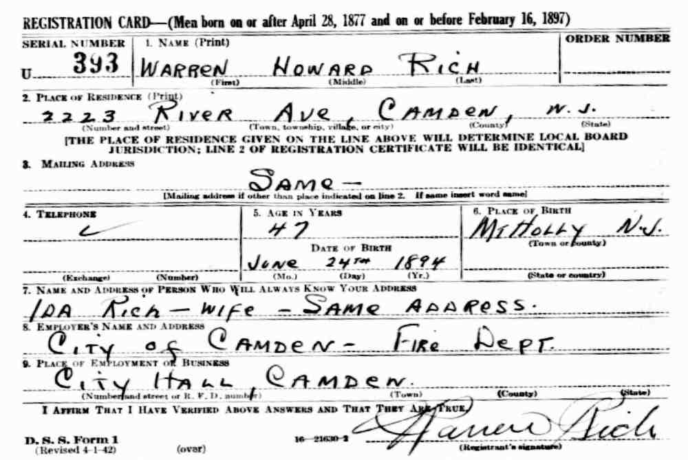 WARREN HOWARD RICH was born on June 24, 1894 in Mt. Holly, new Jersey to George Warren Rich and his wife, the former Ella M. Nutter. The family lived in the 900 block of Penn Street in the mid-1890s. The 1899 City Directory and the 1900 Census shows the family, which included younger siblings Florence and Herbert, 1123 Marion Street. His father was working as a carpenter. They stayed there through 1902, then moved to 538 Grant Street. The 1906 Directory has them at 713 Mt. Vernon Street and the 1908 Directory gives the address as 126 North 36th Street. When the Census was taken in 1910 the Rich family was living at 2710 Westfield Avenue. George W. Rich worked as a carpenter during these years. By the end of 1910 he had moved to 126 North 33rd Street and had gone into business as a building contractor and builder. He later served as building inspector for the City of Camden. Warren Rich married around 1914. He first appears in City Directories in 1915, at 3286 Westfield Avenue. The following years directory has him at 126 North 33rd Street, living with his parents. He and wife Cora and their children were living at 31 South 35th Street in East Camden and working as a carpenter when he registered for the draft in June of 1917. He had previously seen military service in the United States Naval Reserves. Before being called again to service, he took a job in one of Camden's shipyards, and, as a defense worker, was not inducted into the Army. The 1920 Census shows Warren Rich, his wife Cora and daughters Thelma and Vera at 2712 Cramer Street. He was then working as a shipyard carpenter. He was appointed to the Camden Fire Department in June 1920. The family continued to move frequently during the 1920s. Addresses include 2632 Federal Street in 1921, 602 South 5th Street in 1922, 433 Haddon Avenue in 1923, 1340 Argus Road in 1924, 2933 Westfield Avenue in 1927, 2985 Alabama Road in 1928, and 1131 Octagon Road in 1929 and 1930, then back to 2933 Westfield Avenue in 1931. Apparently Cora Rich died in the mid-1920s. The 1930 Census indicates that he had custody of his daughters, and was living with a divorcee, Ida M. Renner and her 10-year old son James. During the 1930s, daughter Thelma married Morris Odell, who would join the Camden Fire Department in 1941. Vera married Gilbert C. Graham. The 1940 Census lists the Warren Rich family at 299 Marlton Avenue, and states that he had been at that address since 1935. His adult daughters were not at home, however his aged parents were living with him. Sadly, second wife Ida also passed away young, in 1945, but not before bearing a son, Warren H. Rich Jr. By April of 1942 Warren Rich had moved to 2223 River Avenue in Cramer Hill, where he would live out his days. Warren Rich retired from the Camden Fire Department in April of 1945. In April of 1963 he was selected to sit on Camden County's grand jury. Warren Howard Rich passed away on May 28, 1970. Warren Rich was survived by his son, Warren Jr., of the River Avenue address, and daughters Mrs. Vera Sweeney and Mrs. Florence Graham. He was buried at Arlington Cemetery in Pennsauken, near his wife Ida, and his father George W. Rich. As stated above, Warren Rich's son-in-law, Morris Odell, was a member of the Camden Fire Department. Grandson Robert Odell also made a career of the Camden Fire Department. Between grandson, father, and father-in-law there was 73 years of continuous service. |
