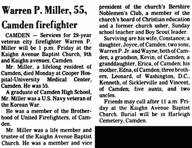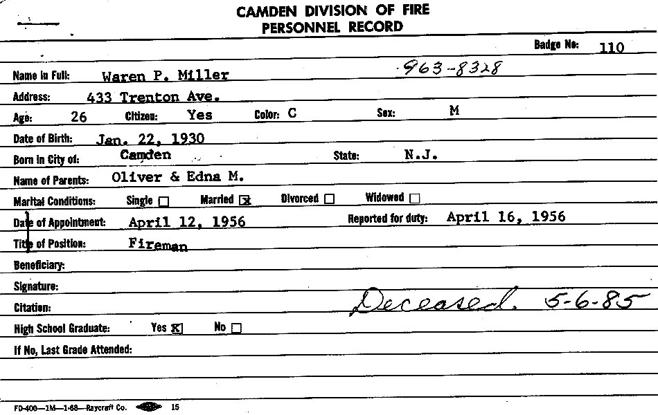 WARREN P. MILLER was born in Camden, New Jersey on January 22, 1930 to Oliver and Edna Miller. His early years were spent at 743 Walnut Street. By 1940 his family had moved to 1142 Baring Street. The family was at 807 Walnut Street when the 1943 Camden City Directory was compiled, and they were still at that address in 1947. Oliver Miller and family had moved to 780 Walnut Street by the mid-1950s. After serving in the United States Navy during the Korean War, Warren P. Miller was appointed to the Camden Fire Department on April 12, 1956. He reported for duty four days later. The 1956 New Jersey Bell Telephone Directory shows Warren Miller at 2114 Watson Street in East Camden. He moved to 433 Trenton Avenue during the 1960s, and was still at that address as late as 1977. Warren P. Miller passed away on May 6, 1985, leaving a widow, Constance Miller, and a son, Wayne V. Miller, who was appointed to the the Camden Fire Department on December 16, 1987. Sadly, Wayne V. Miller was killed in a car accident in July of 1990. |